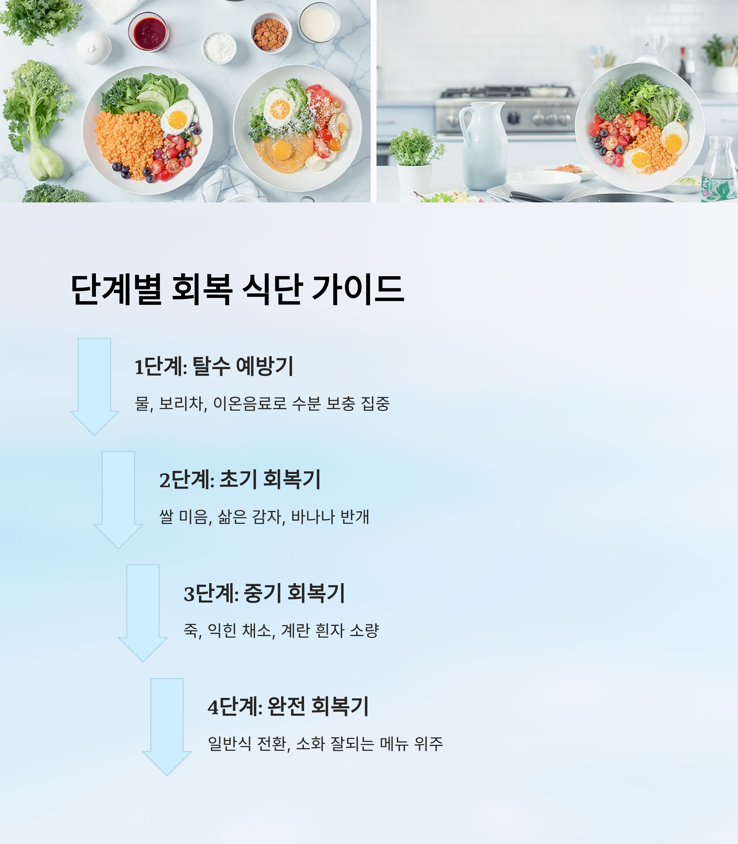 🔹 **1단계 (탈수 예방기)** – 증상: 설사, 구토 심함 – 식사: 물, 보리차, 이온음료, ORS(전해질 수액) – 팁: 식사 대신 수분 보충 집중! 소량씩 자주 마셔야 해요.