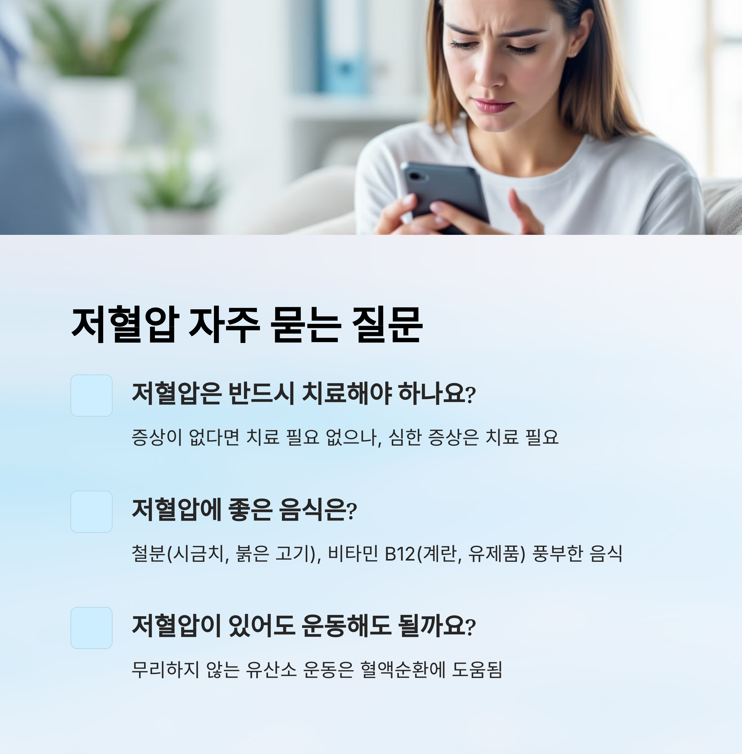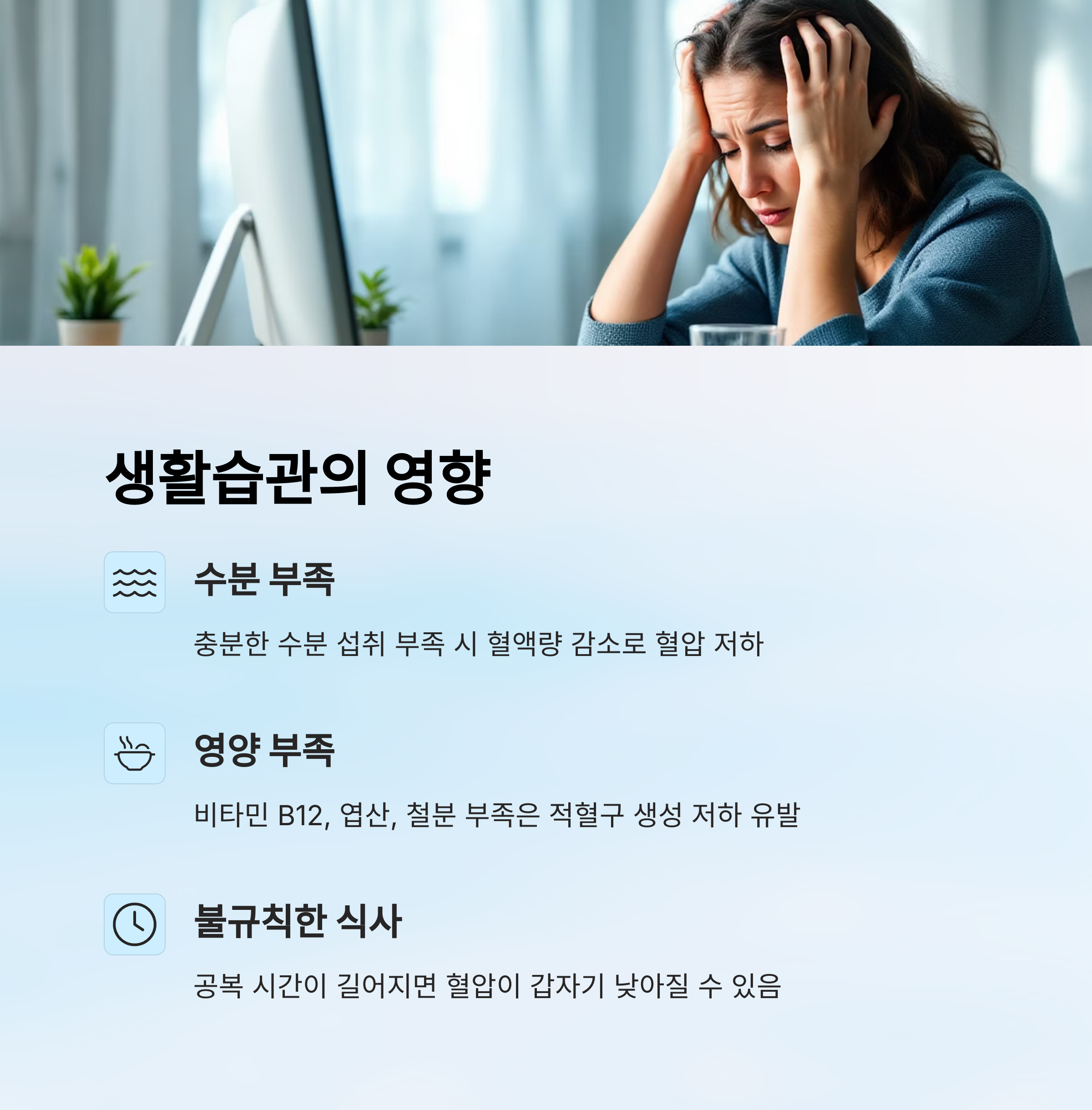 | 영양 결핍 | 철분, 비타민 B12 부족 시 저혈압 위험 증가 |