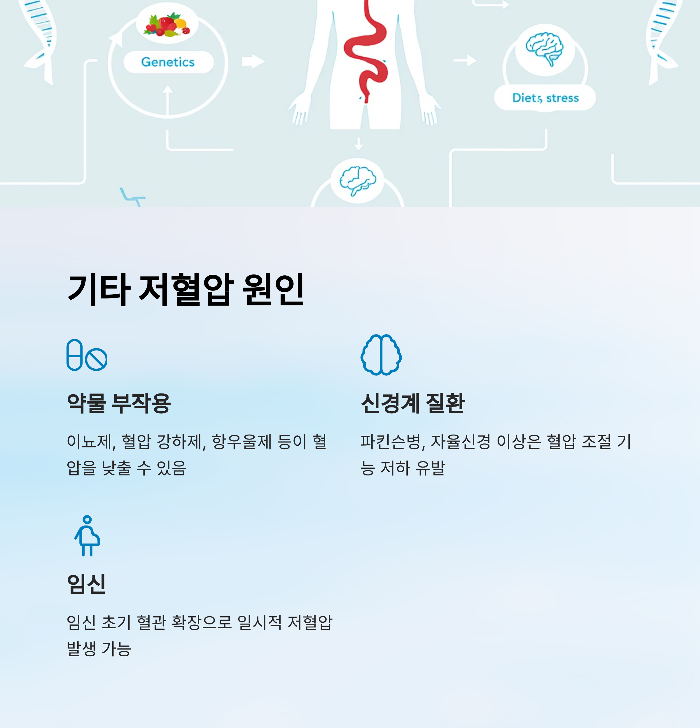 저혈압은 유전이나 생활습관 외에도 다양한 요인에 의해 발생할 수 있어요. 특정 질환이나 약물 복용, 호르몬 이상 등도 저혈압의 원인이 될 수 있어요.