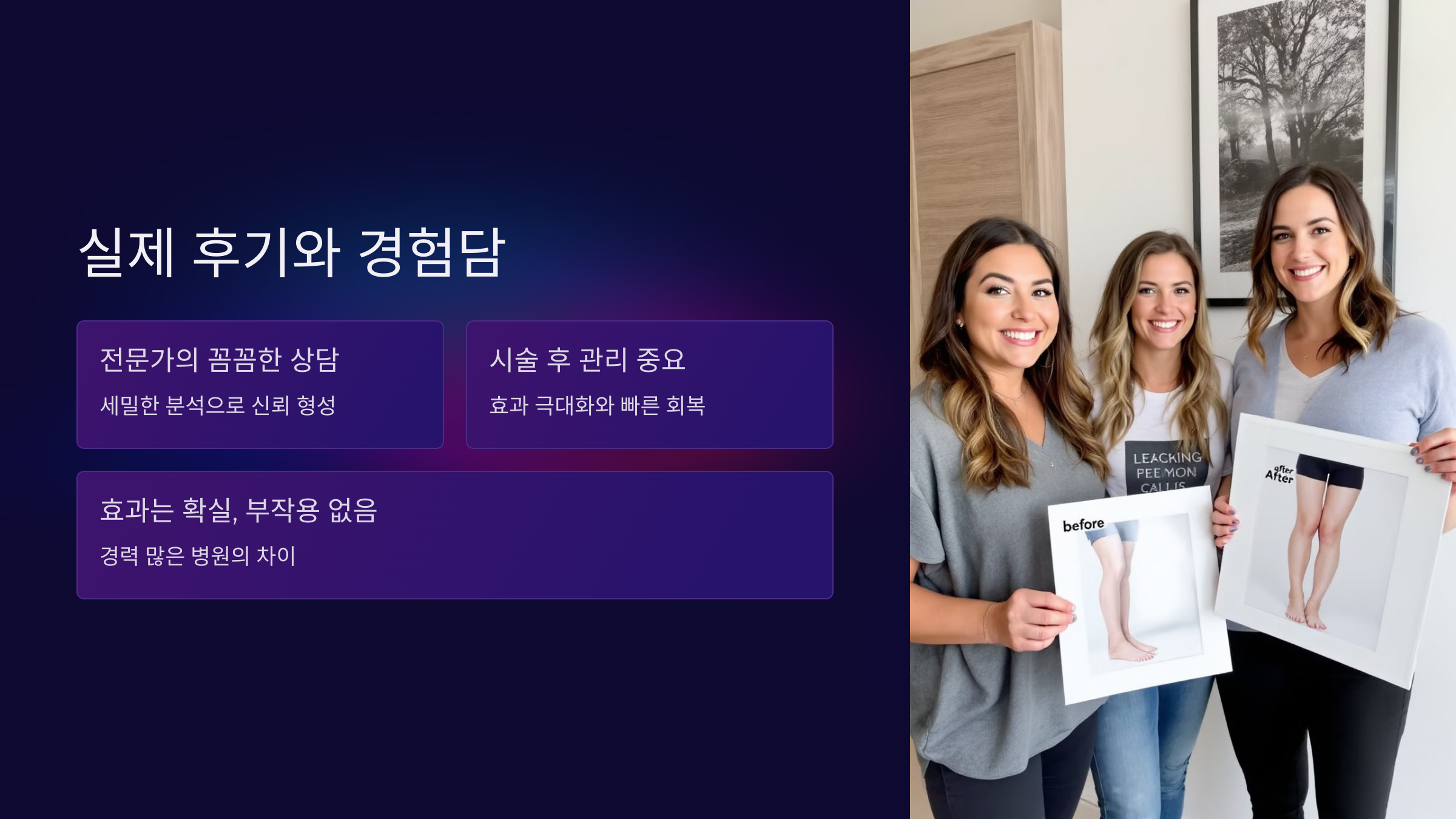 "시술 전에는 걱정이 많았지만, 믿을 만한 병원을 선택한 덕분에 부작용 없이 효과만 제대로 봤어요. 확실히 경력이 많은 병원은 다르더라고요!"