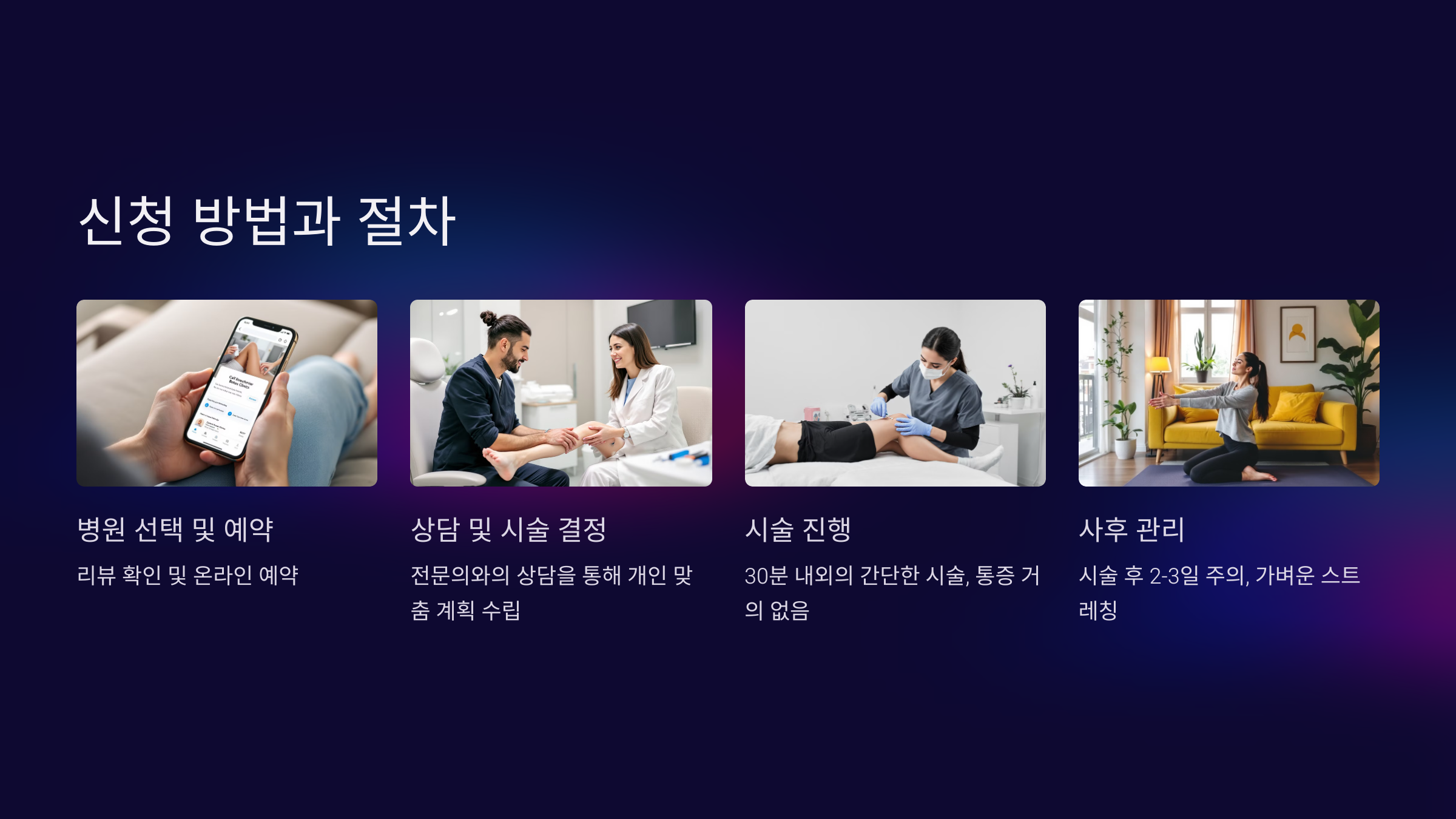 - 상담에서 본인의 종아리 상태를 확인받고, 적합한 시술 계획을 세웁니다.