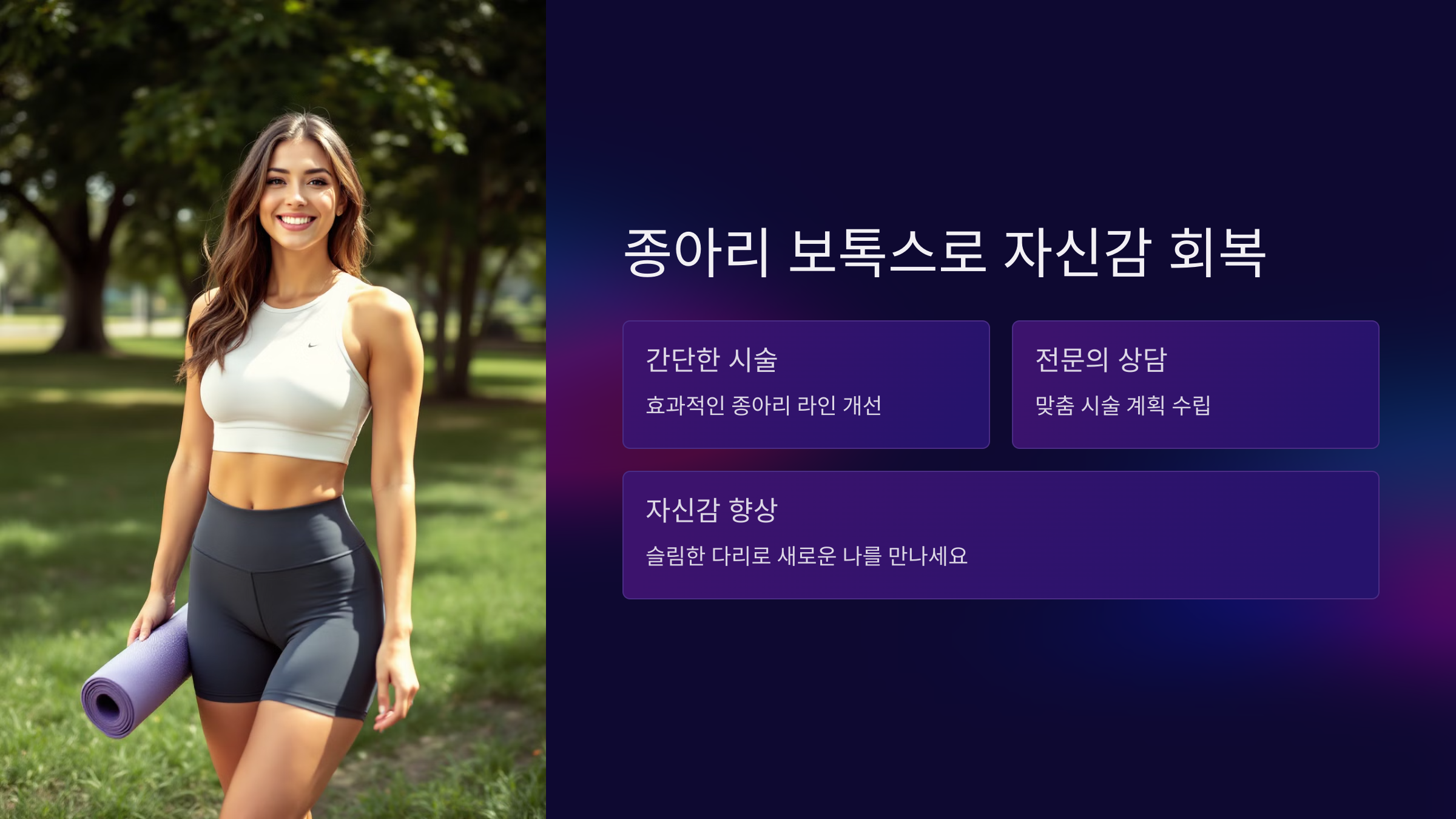 종아리 보톡스는 간단하면서도 효과적으로 종아리 라인을 개선할 수 있는 방법입니다. 다이어트와 운동으로 해결되지 않던 고민을 시술로 풀어보는 건 어떨까요? 😊