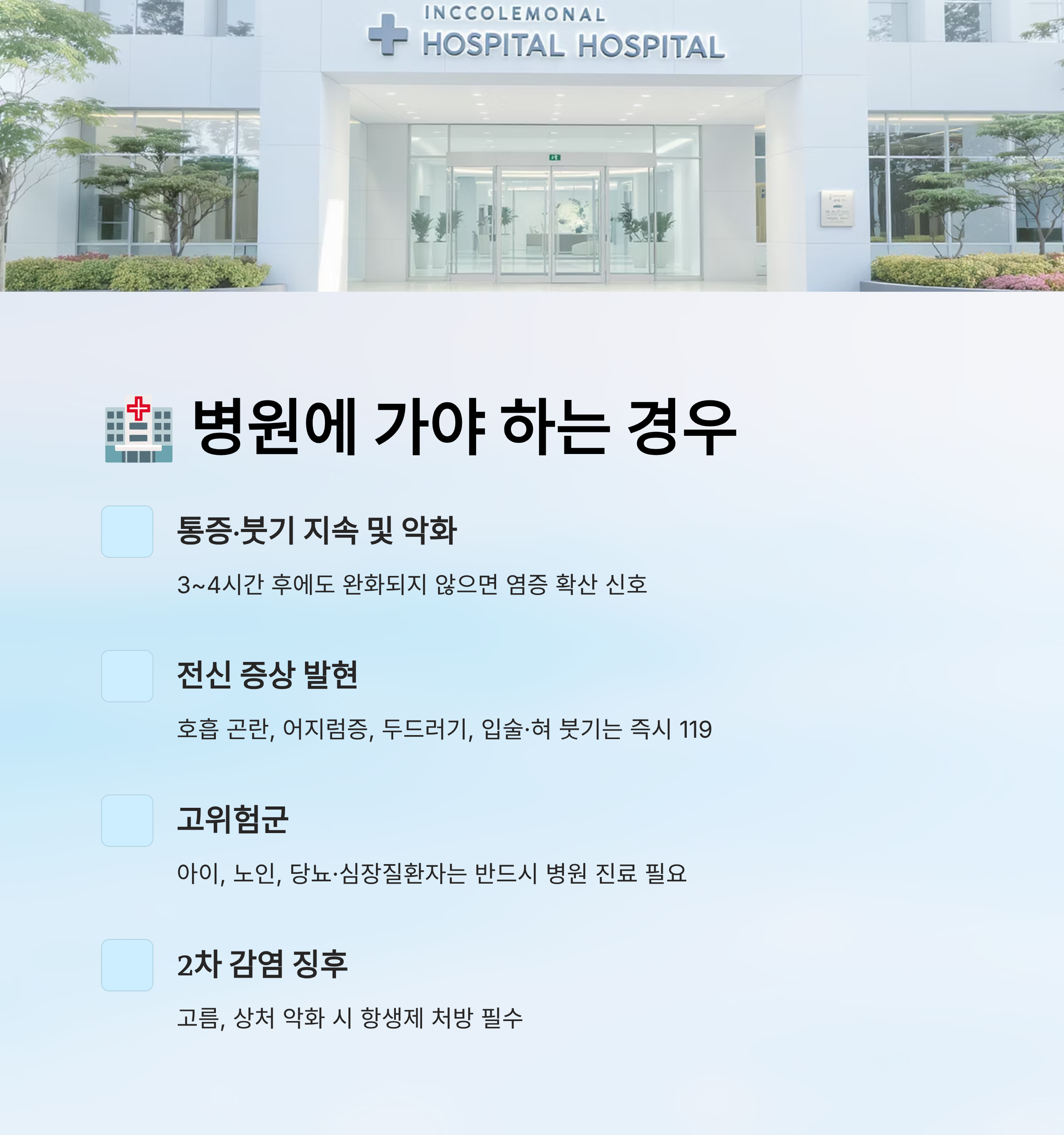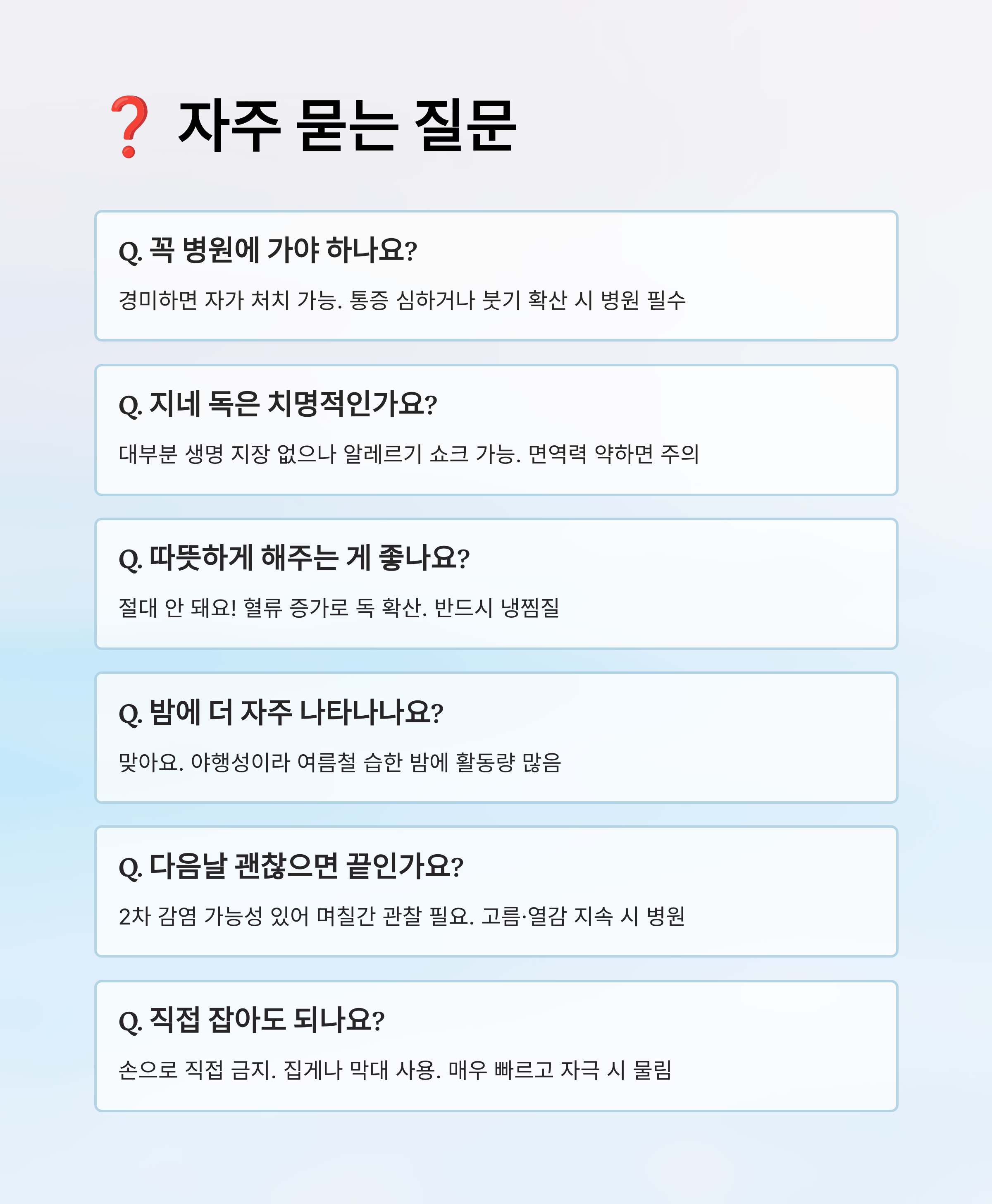 A1. 증상이 경미하면 자가 처치로 충분하지만, 통증이 심하거나 붓기가 빠르게 퍼지면 병원 진료가 필요해요. 특히 알러지 체질이라면 반드시 가야 해요.