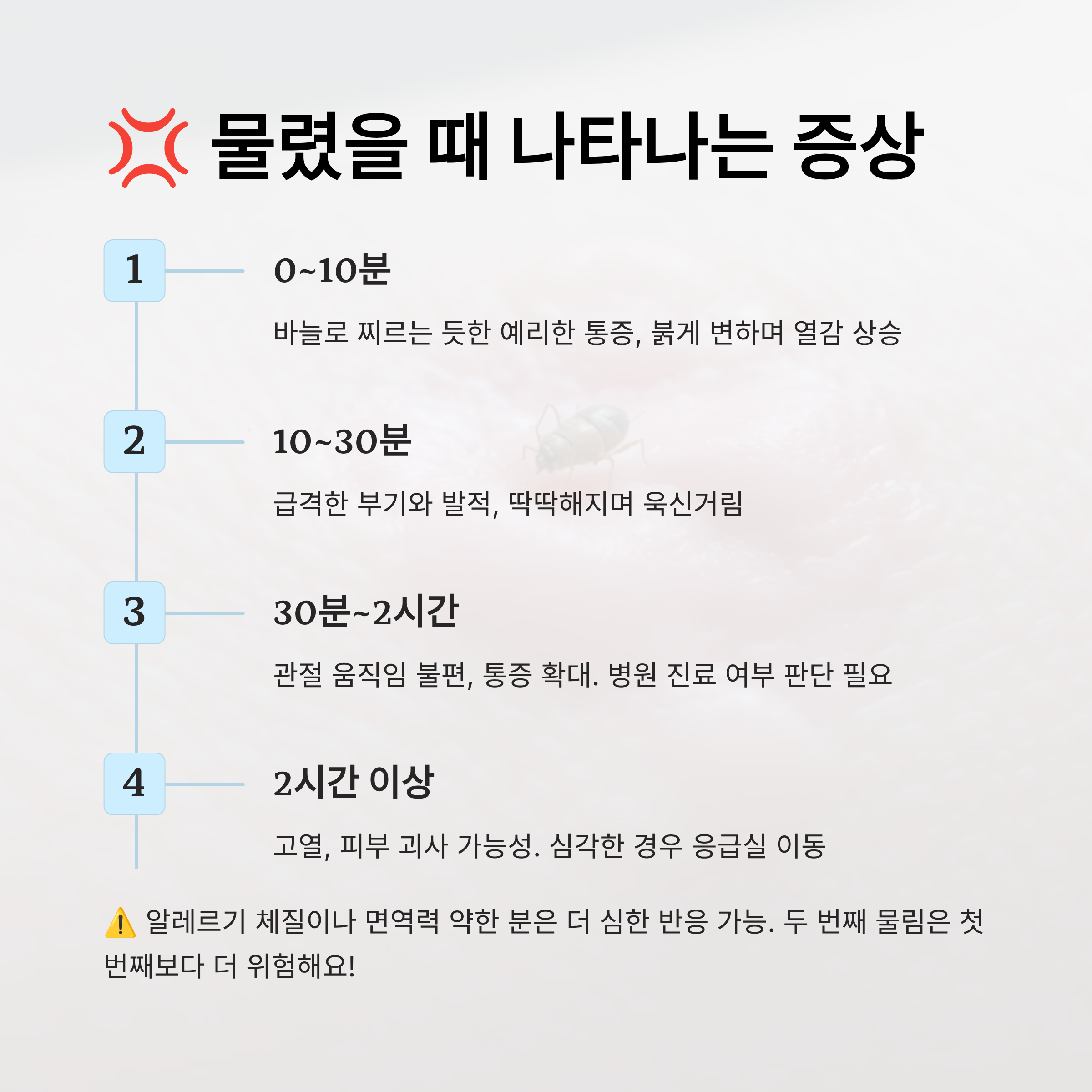 | 0~10분 | 찌릿한 통증, 열감 | 즉시 냉찜질, 독 확산 방지 |