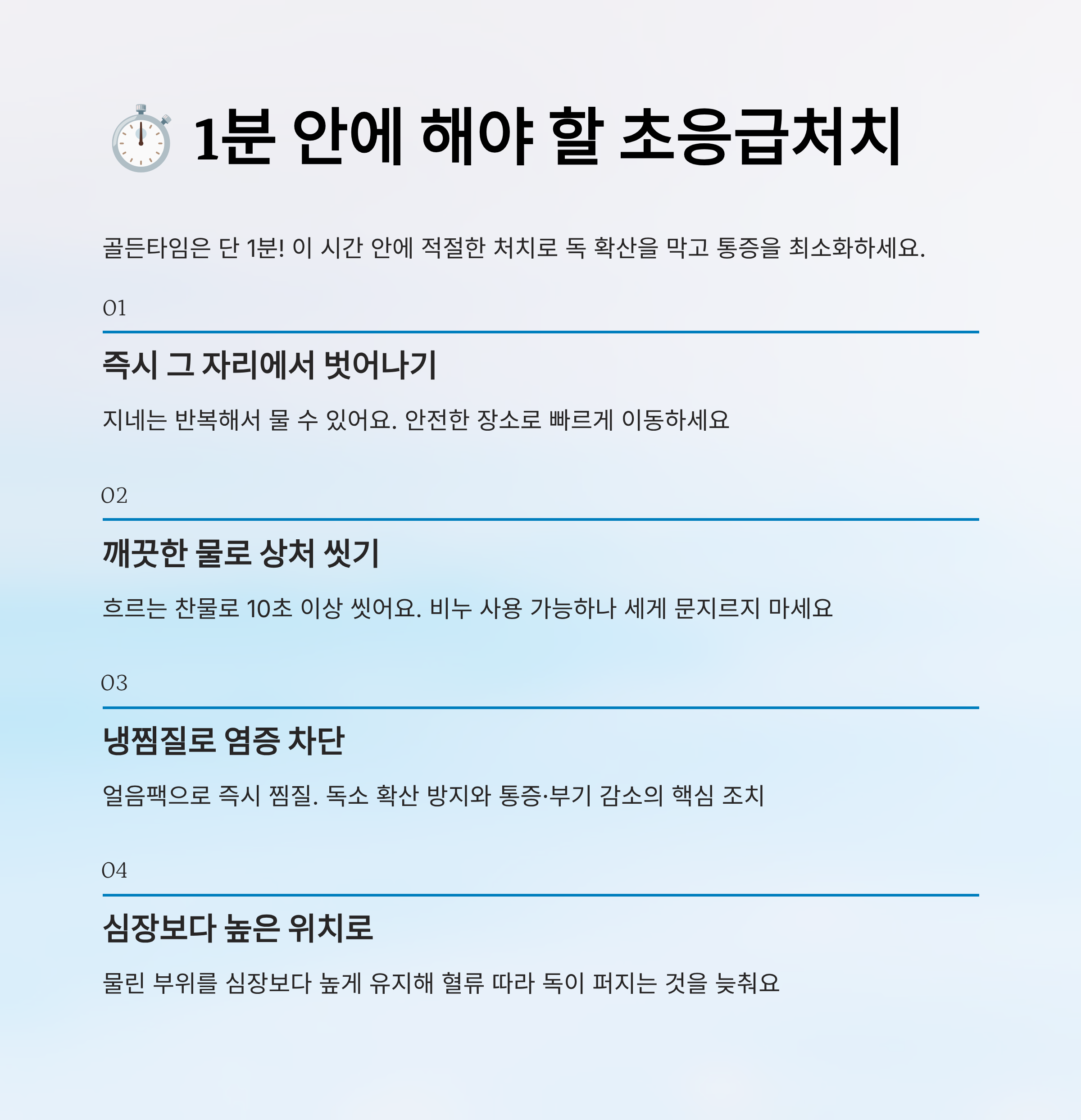 지네에 물렸다면, 머뭇거릴 시간이 없어요. 골든타임은 단 1분! 이 시간 안에 적절한 처치를 해주면 독의 확산을 줄이고, 통증과 후유증도 최소화할 수 있어요. 지금부터 알려드리는 단계들을 그대로 따라 해보세요!