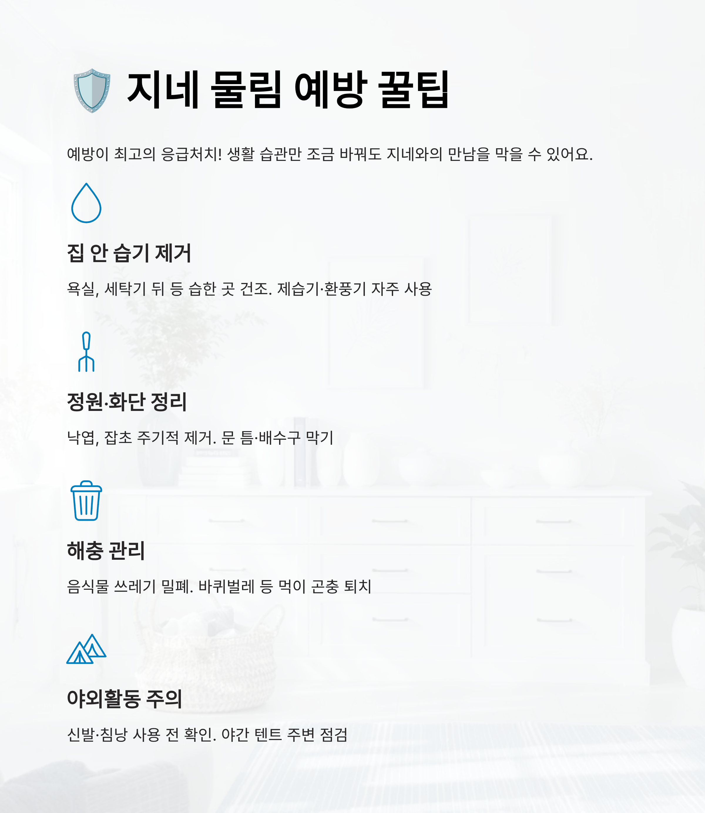 예방이 최고의 응급처치라는 말, 정말 맞는 말이에요! 지네 물림은 한순간의 방심으로 찾아오지만, 평소 조금만 신경 쓰면 충분히 막을 수 있어요. 특히 습한 계절이나 장마철엔 더 주의해 주세요. 지금이라도 오늘 집 안을 한 번 둘러보는 건 어때요? 😉
