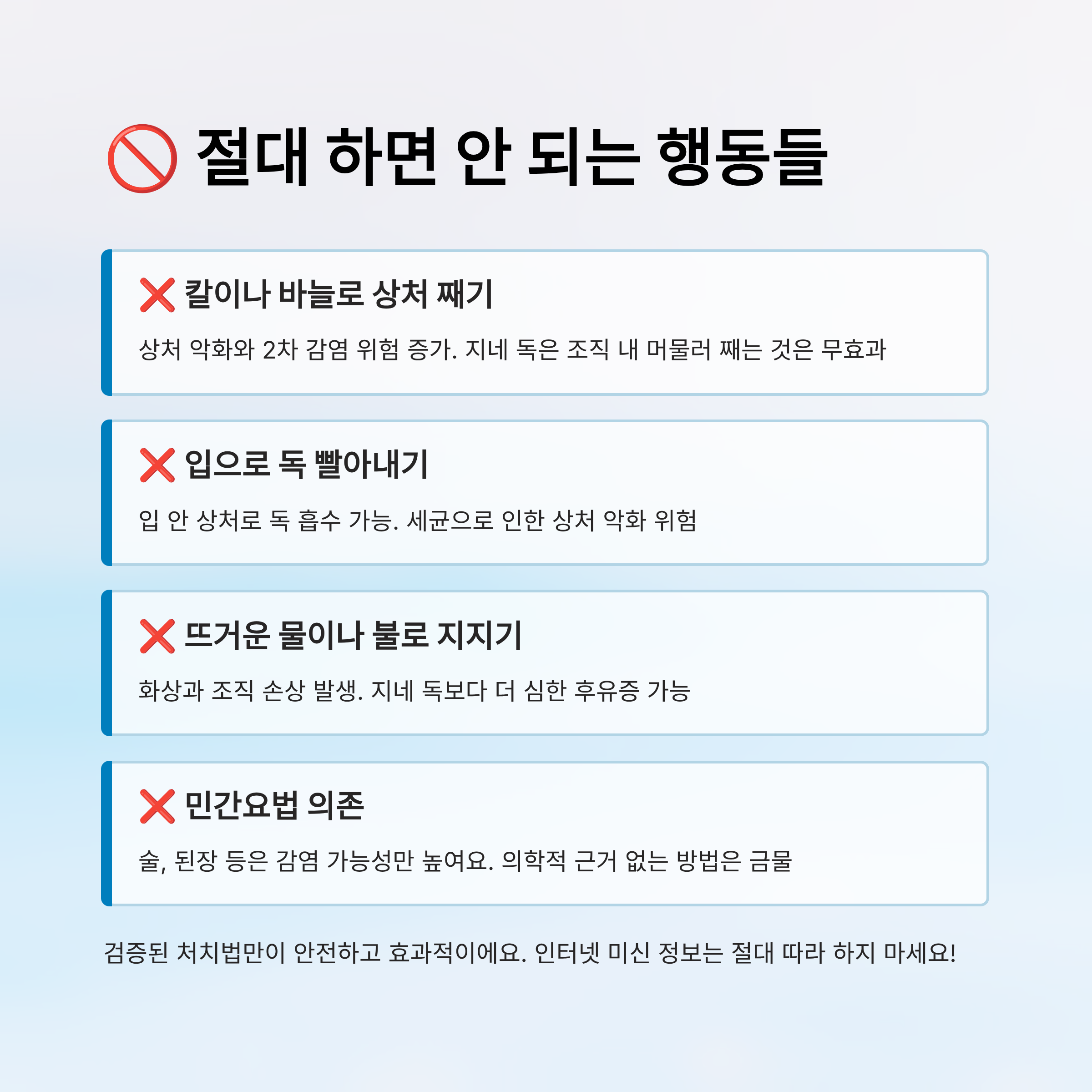| 입으로 독 빼기 | 🔴 매우 위험 | 2차 감염 및 독 흡수 가능 |
