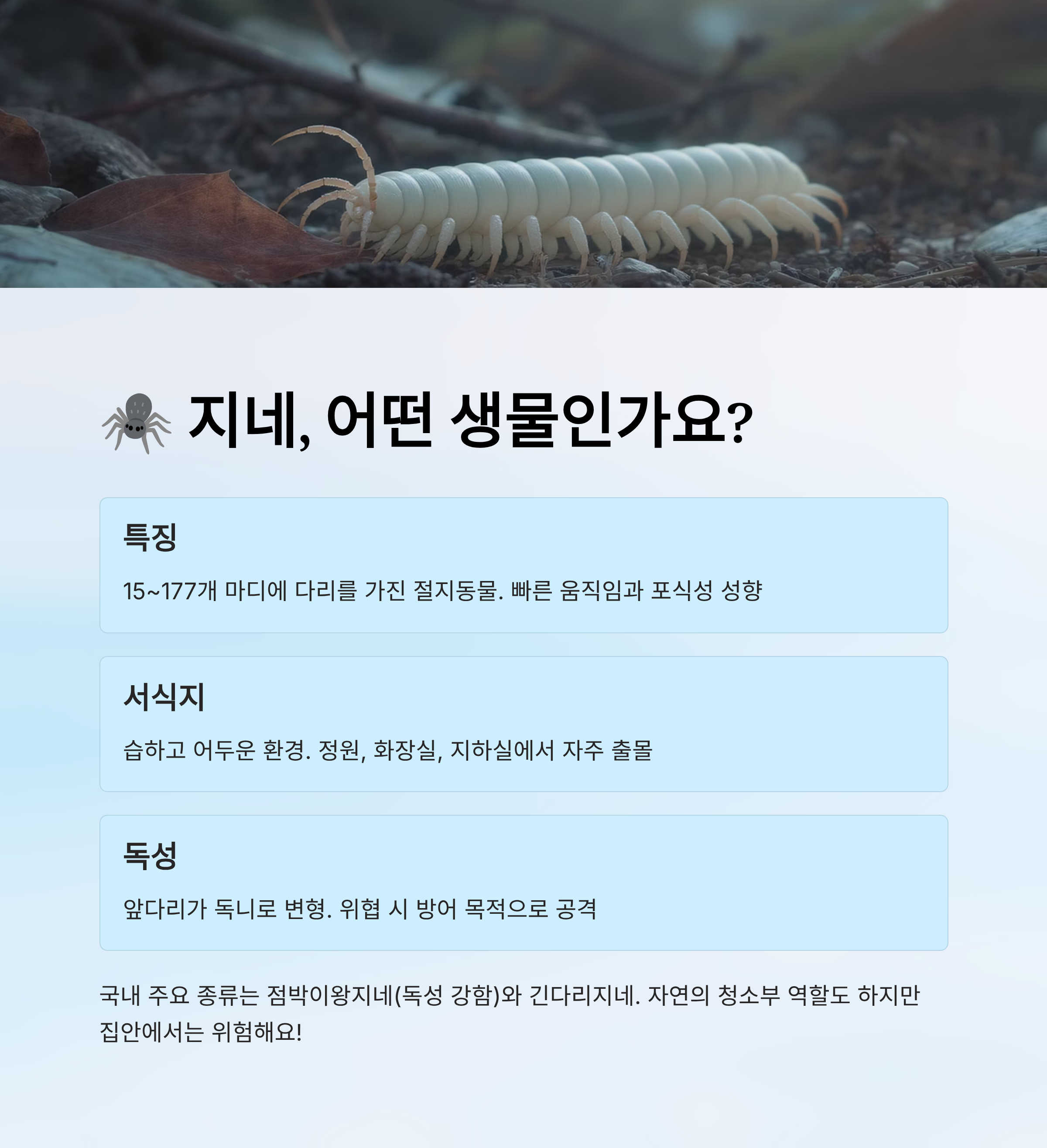 지네는 본래 다른 곤충을 잡아먹는 포식자예요. 그래서 바퀴벌레, 거미, 파리 같은 곤충이 많으면 지네도 따라 들어오게 돼요. 쓰레기는 밀폐하고, 음식물은 바로바로 치우는 습관을 들이면 좋고, 살충제 사용도 병행하면 더욱 효과적이에요.