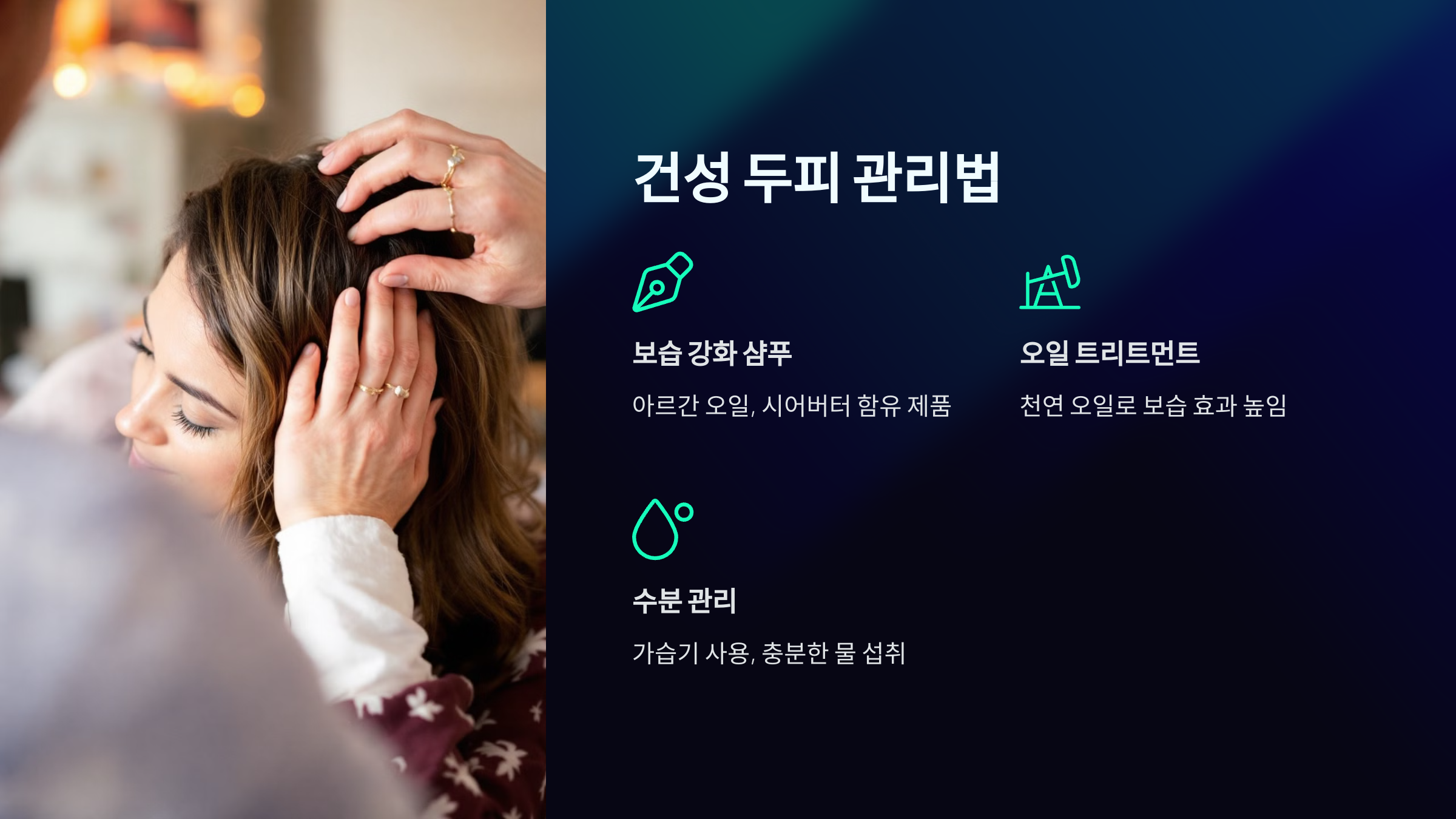 - 건조한 두피를 위한 보습 성분이 풍부한 샴푸를 사용하세요. 아르간 오일, 시어버터, 히알루론산이 함유된 제품이 추천됩니다.