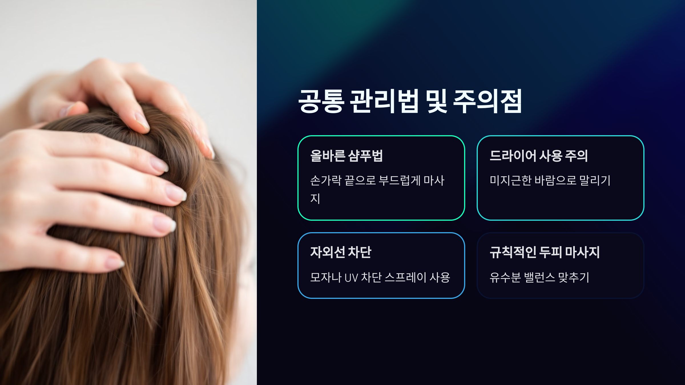- 올바른 샴푸법: 손톱이 아닌 손가락 끝을 이용해 부드럽게 두피를 마사지하듯 씻으세요.