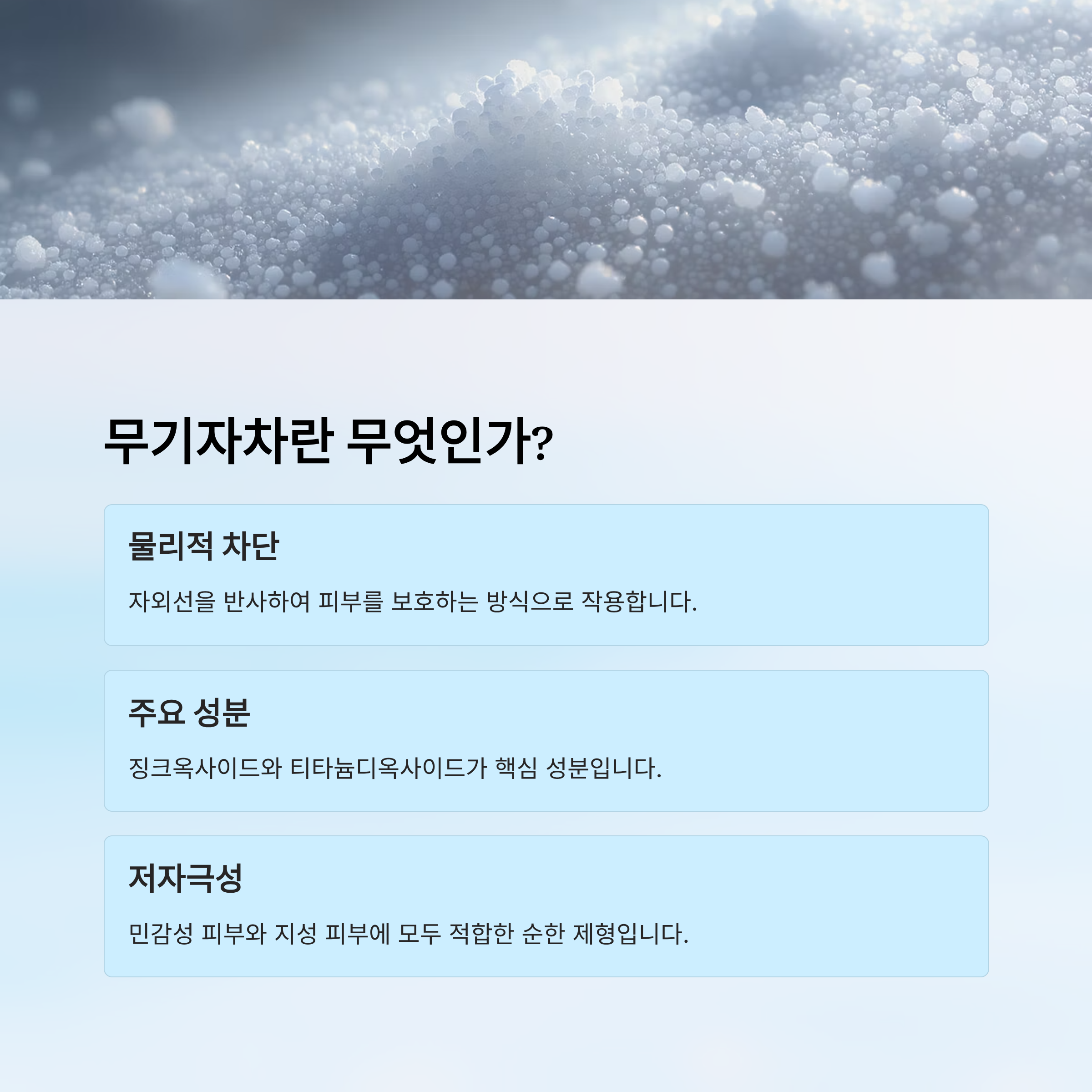 무기자차는 물리적 자외선 차단제라고도 불리며, 피부 표면에 보호막을 형성해 자외선을 '반사'해주는 방식으로 작용해요. 주요 성분으로는 징크옥사이드(Zinc Oxide)와 티타늄디옥사이드(Titanium Dioxide)가 있고, 이 성분들은 자외선을 흡수하지 않고 튕겨내는 특성을 가지고 있어요.