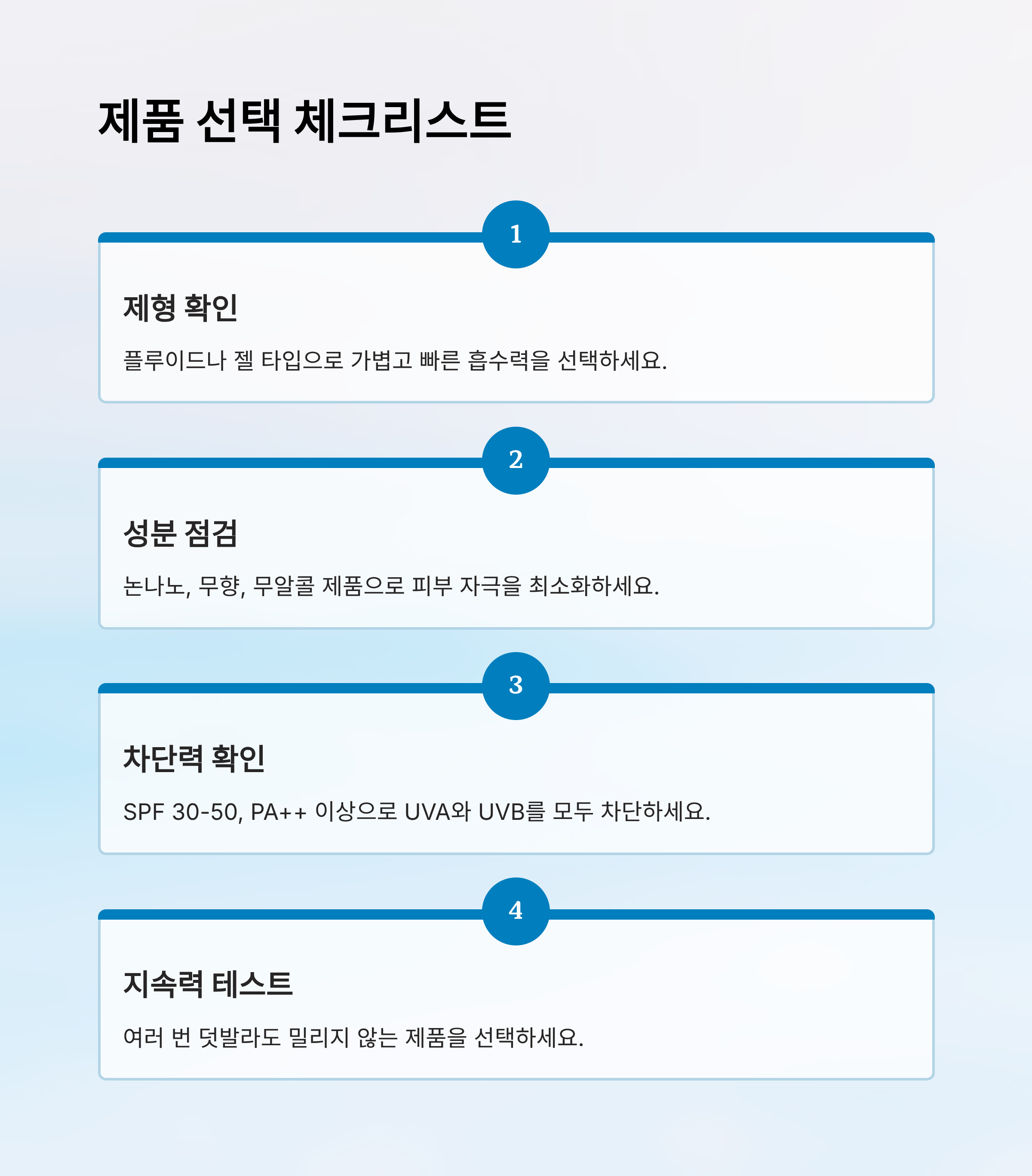 셋째, 알러지 유발 성분이나 인공 향료, 알코올 유무도 중요해요. 피부에 자극을 줄 수 있는 요소들은 가급적 피하는 게 좋아요. 성분표를 꼼꼼히 살펴보고, 가능한 저자극 인증 제품이나 피부과 테스트 완료 표시가 있는 걸 추천해요.