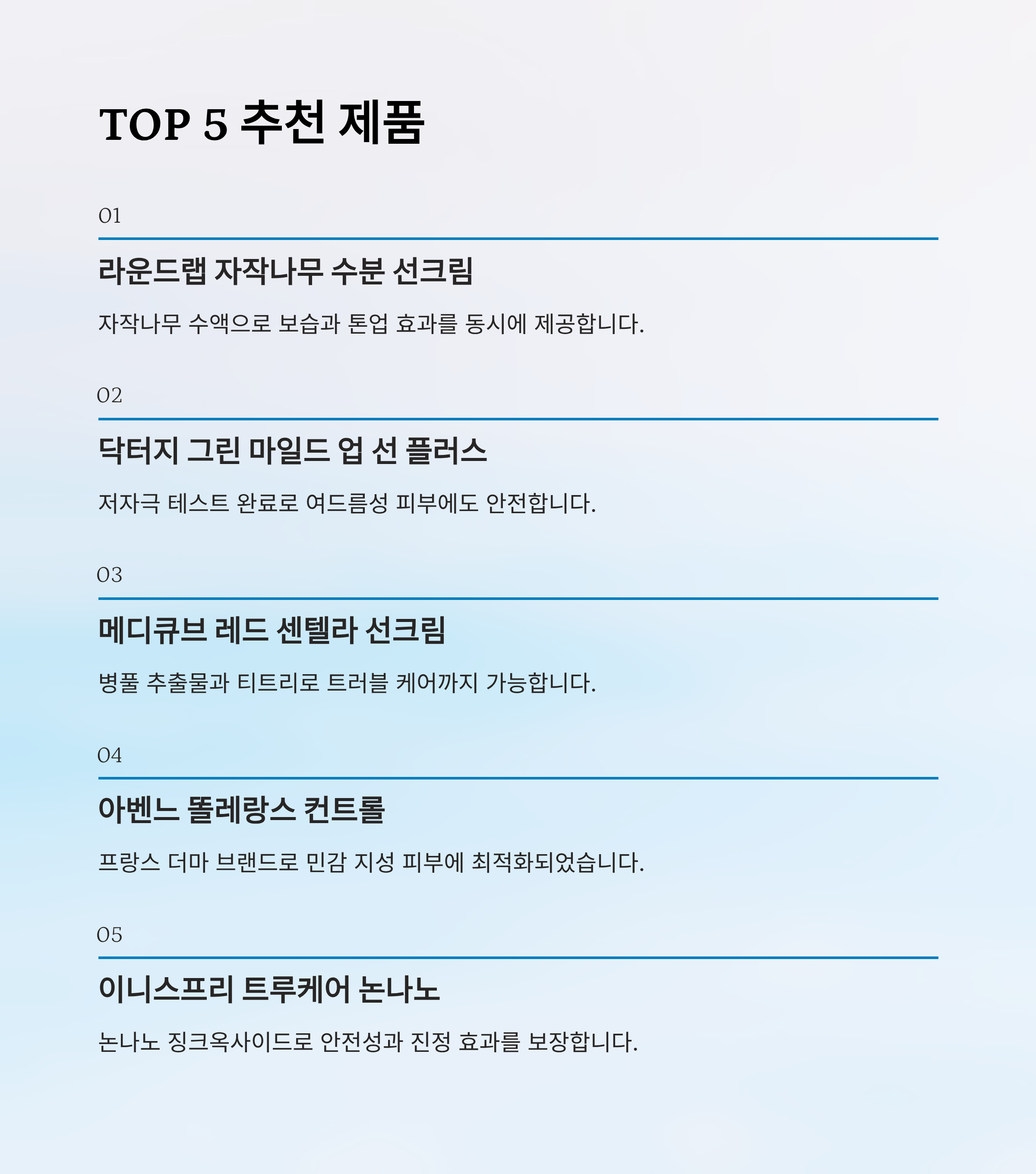 지성 피부를 위한 무기자차는 정말 많지만, 성분, 사용감, 리뷰, 성능까지 꼼꼼히 따져봤을 때 만족도가 높은 TOP 5 제품을 정리했어요. 번들거리지 않고 산뜻하면서도 확실한 차단력을 가진 제품만 엄선했답니다. 2025년 기준으로도 여전히 강력 추천할 수 있는 아이템들이에요!