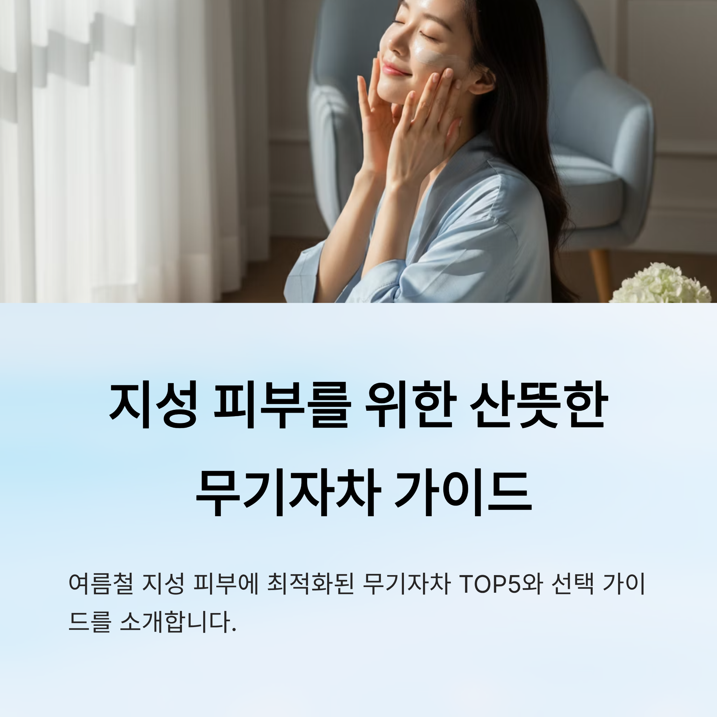지성 피부라면 특히 무기자차의 '산뜻함'과 '저자극성'이 매우 유리하게 작용해요. 피지를 흡착하거나 모공을 막지 않는 제품들이 많기 때문에, 여드름이나 뾰루지가 고민인 분들에게 딱이에요.