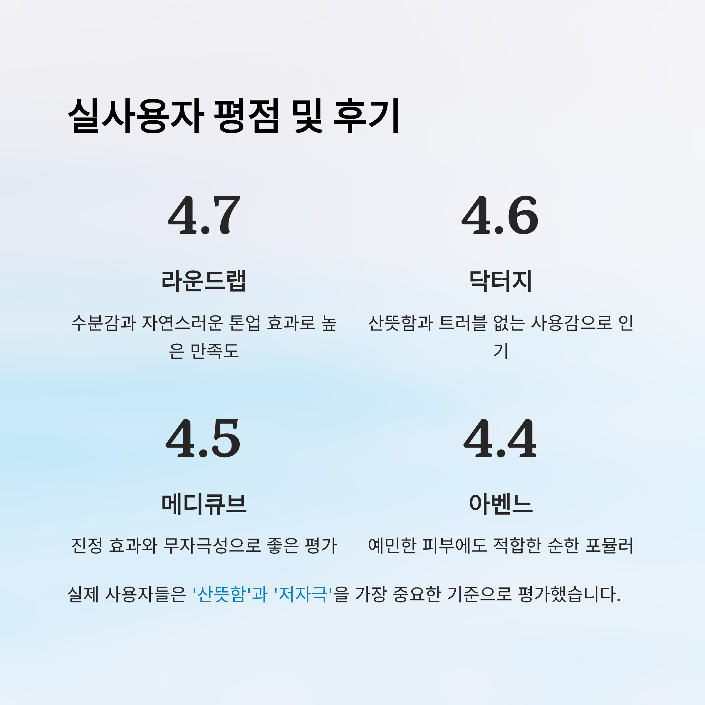 | 아벤느 | 4.4 | 예민 피부에 적합 | 약간 무거움 |