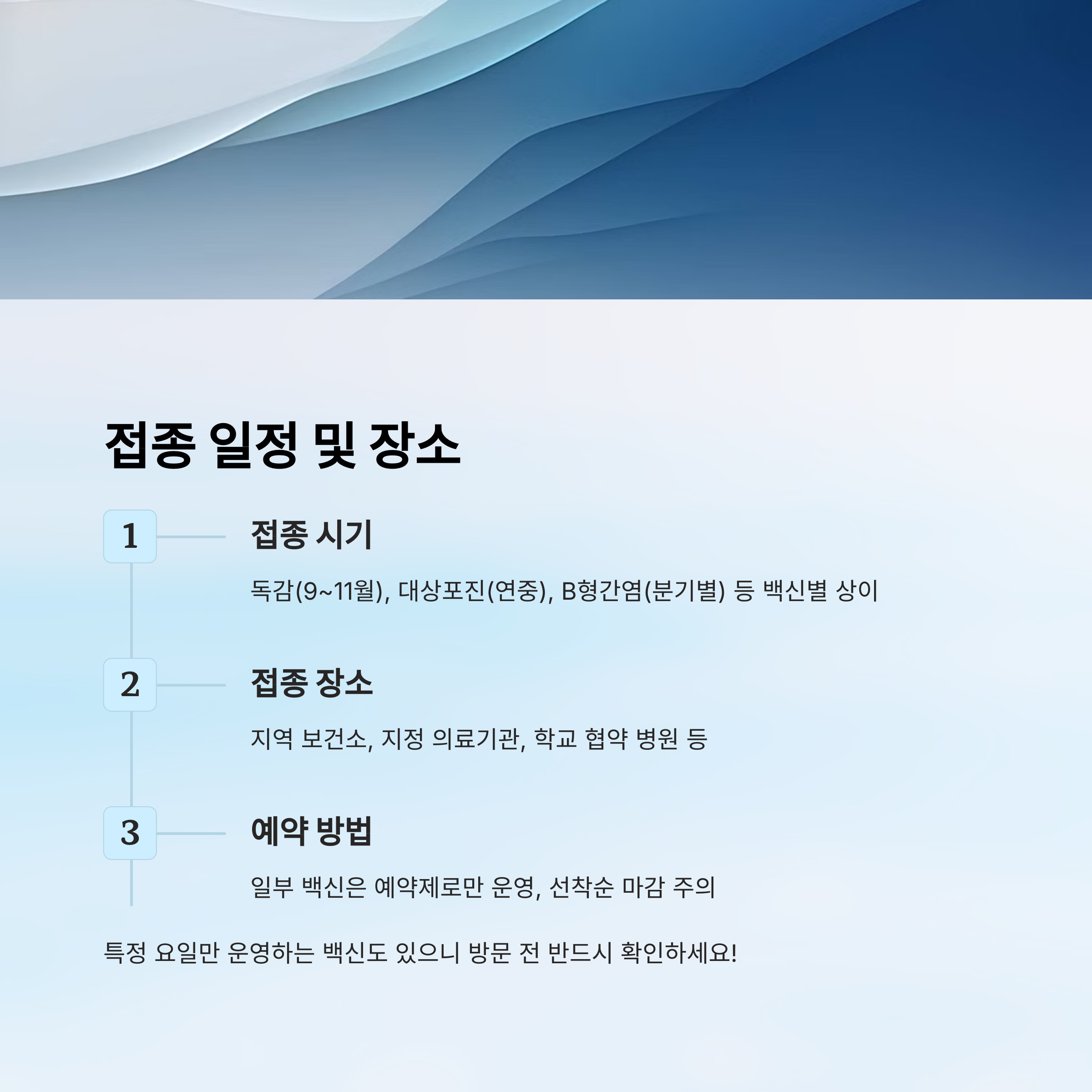 접종 장소는 일반적으로 ‘지역 보건소’, ‘지정 의료기관’, ‘학교 협약 병원’이 주를 이루어요. 대상자마다 지정 장소가 다를 수 있으니 확인 필수! 특히 일부 백신은 ‘예약제’로만 운영되니 주의해야 해요.
