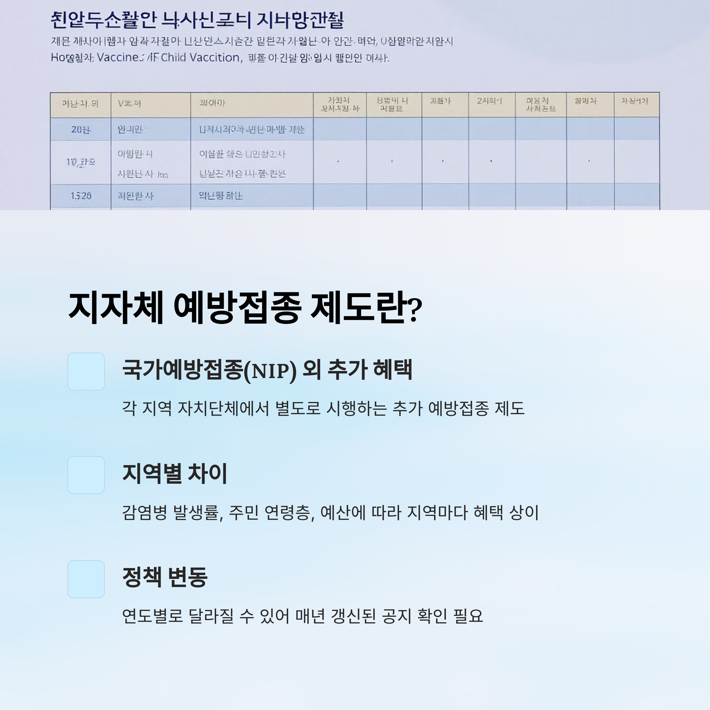 지자체 예방접종은 감염병 발생률, 주민 연령층 구성, 예산 상황에 따라 달라지기 때문에 지역마다 차이가 큰 게 특징이에요. 예를 들어 서울 강남구에서는 대상포진 백신을 만 65세 이상에게 무료 제공하지만, 다른 지역에서는 유료일 수 있어요.