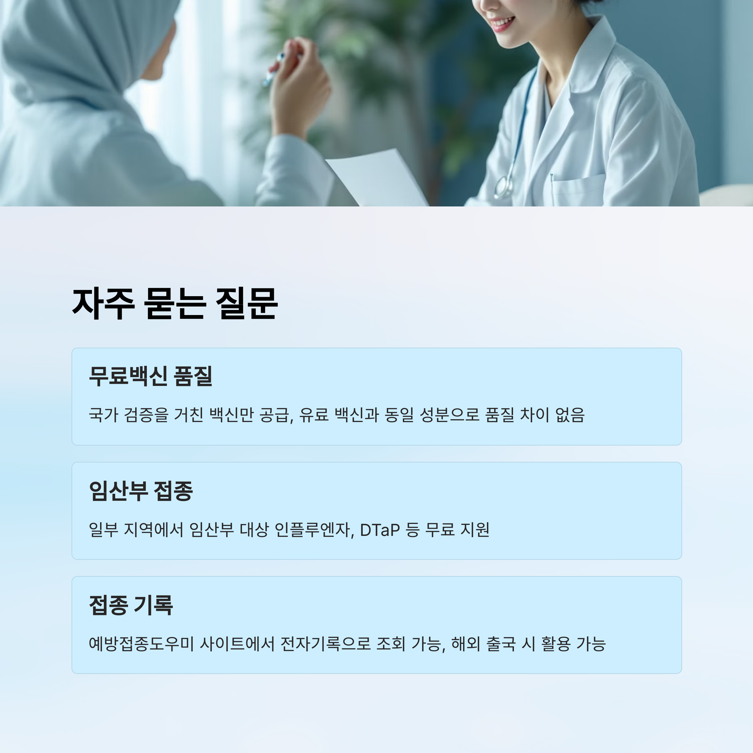 A2. 국가 검증을 거친 백신만 공급돼요. 유료 백신과 동일 성분으로 품질 차이는 없어요.