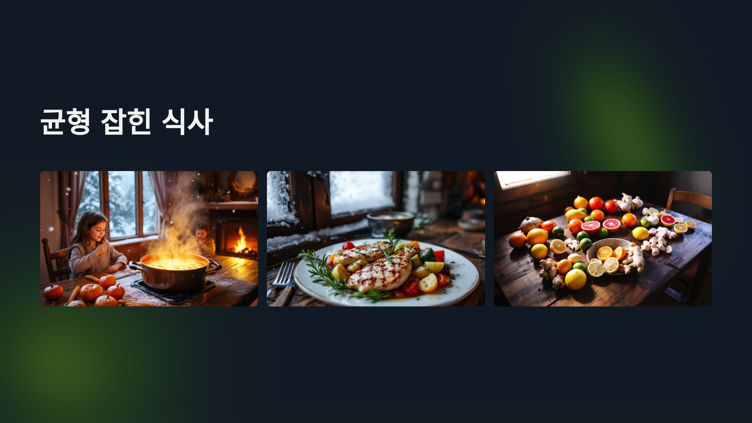 - 면역력 강화 음식: 비타민C가 풍부한 감귤류와 단백질이 많은 닭고기, 생선을 섭취하세요.