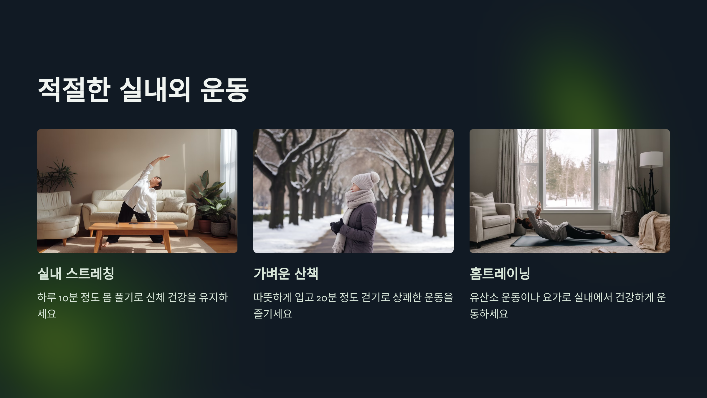 춥다고 집 안에만 머물면 혈액순환이 둔해지고 면역력이 약해질 수 있습니다. 가벼운 운동으로 몸을 활성화시켜 보세요.