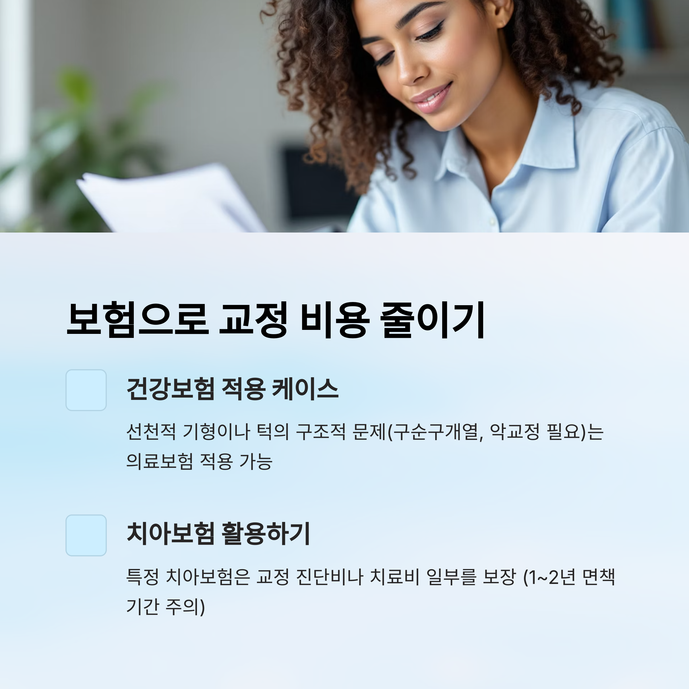 단, 보험 적용은 교정을 시작하기 전 가입되어 있어야 하며, 대부분의 보험사는 1~2년의 면책기간을 두기 때문에 '미리 준비하는 자세'가 중요해요. 갑자기 필요하다고 바로 보장이 되는 건 아니에요!