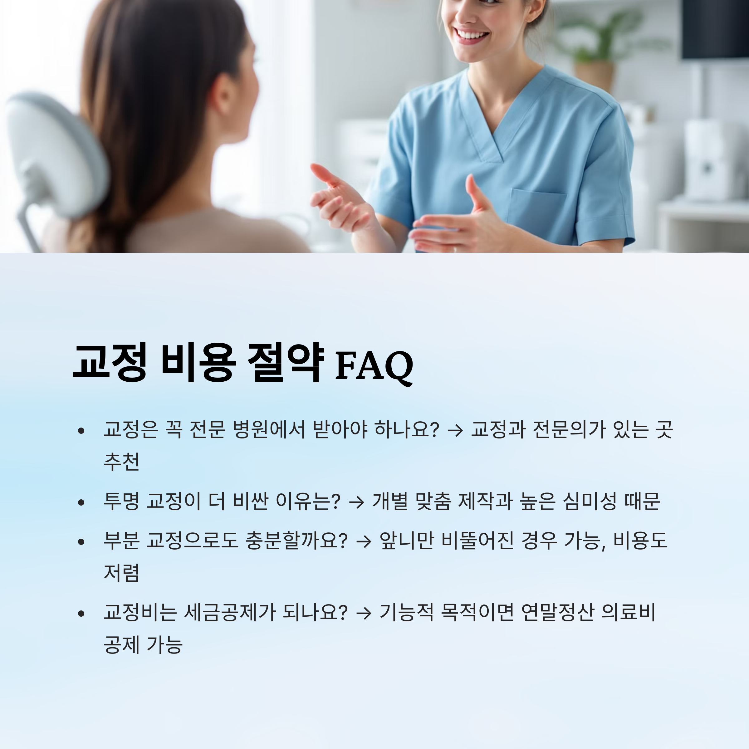 비용을 아끼고 싶다면 자신에게 꼭 필요한 수준의 교정만 진행하는 것도 좋은 방법이에요. 간단한 부분 교정은 전체 교정보다 훨씬 저렴하니까요!