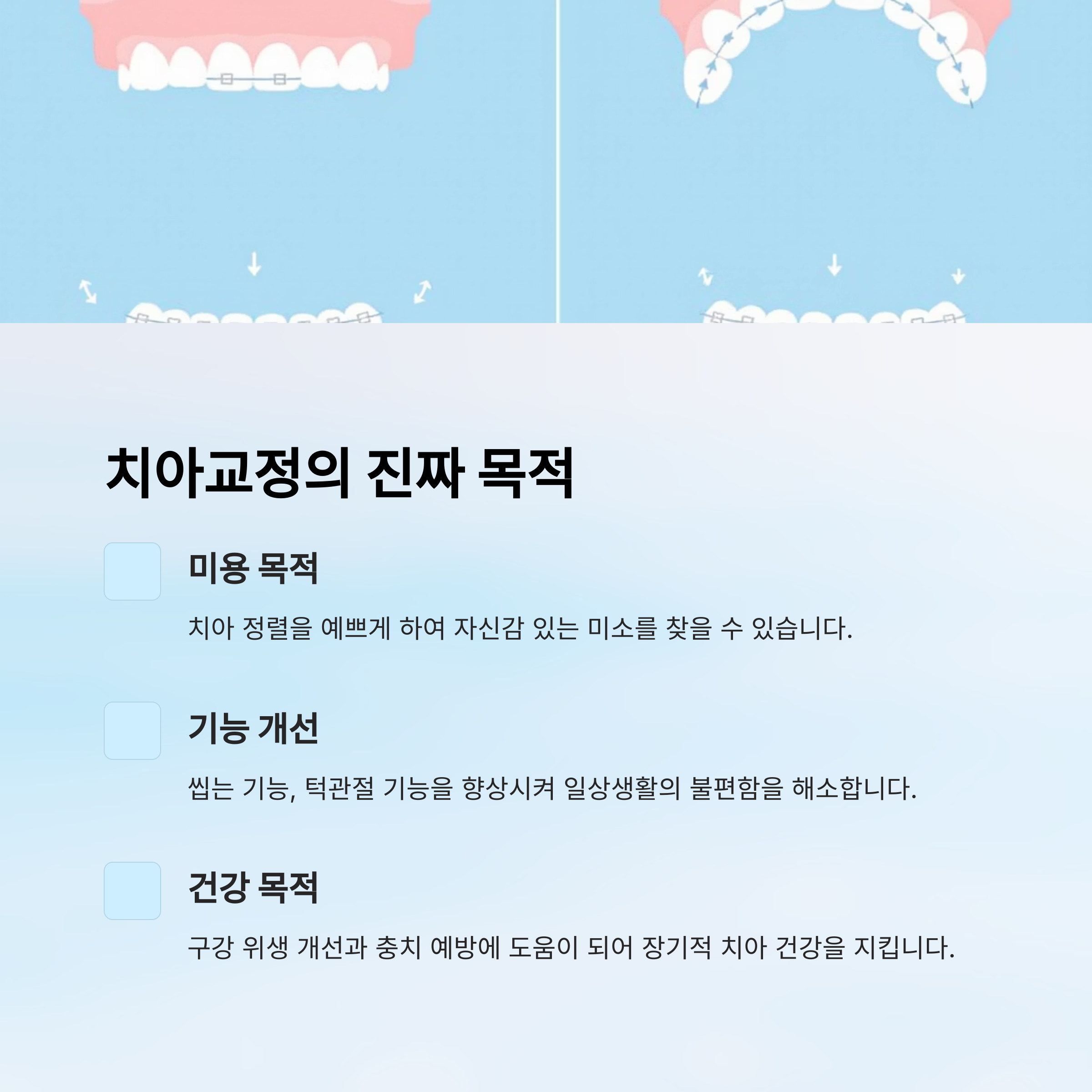 치아교정은 비뚤어진 치아나 부정교합을 바로잡아 치아와 턱의 기능을 개선하는 치료예요. 외모를 위해서 시작하는 경우도 많지만, 실은 씹는 기능, 발음, 구강 위생까지 영향을 준답니다.