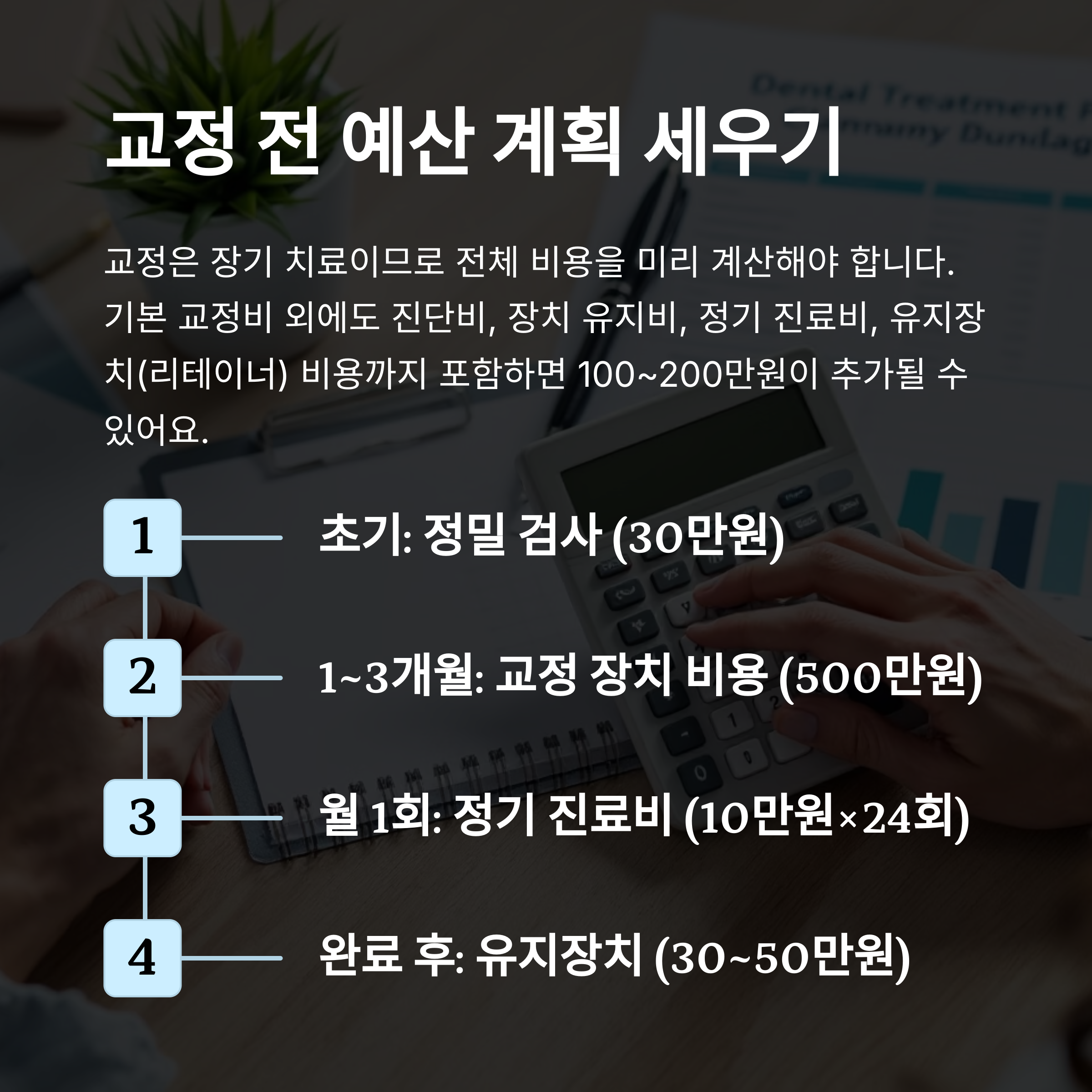 치아교정은 단기간에 끝나는 치료가 아니기 때문에 장기적인 예산 계획이 꼭 필요해요. 단순히 교정비만 생각하는 게 아니라 전체 치료 과정에서 들어갈 비용을 모두 계산해야 하죠.