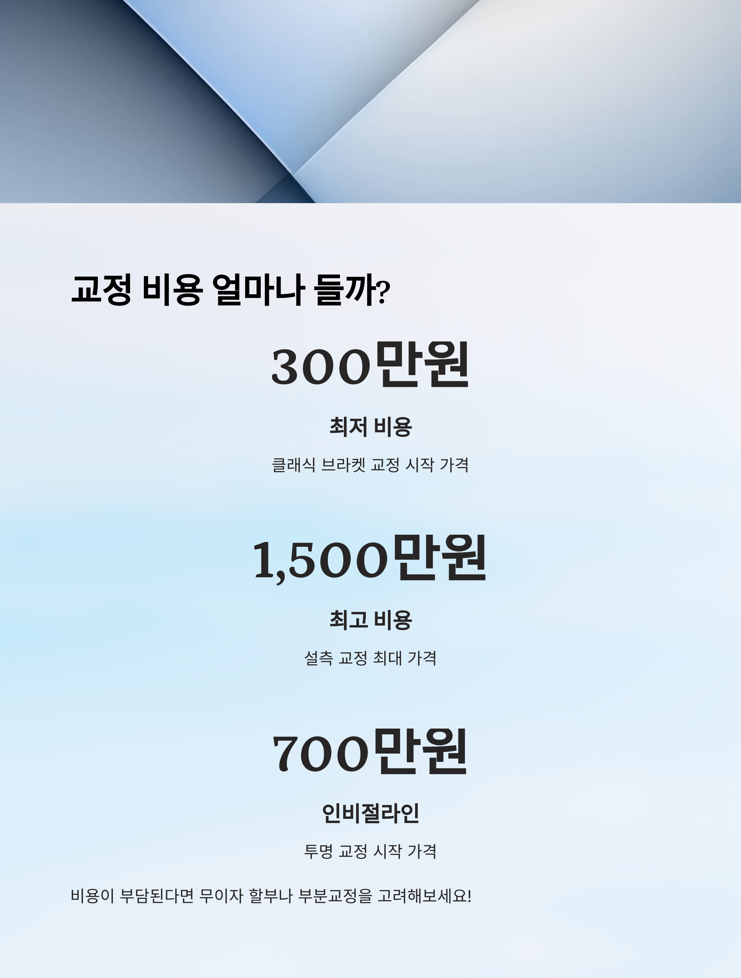 | 클래식 브라켓 교정 | 300만 원~700만 원 | 가장 일반적이고 비용이 낮음 |