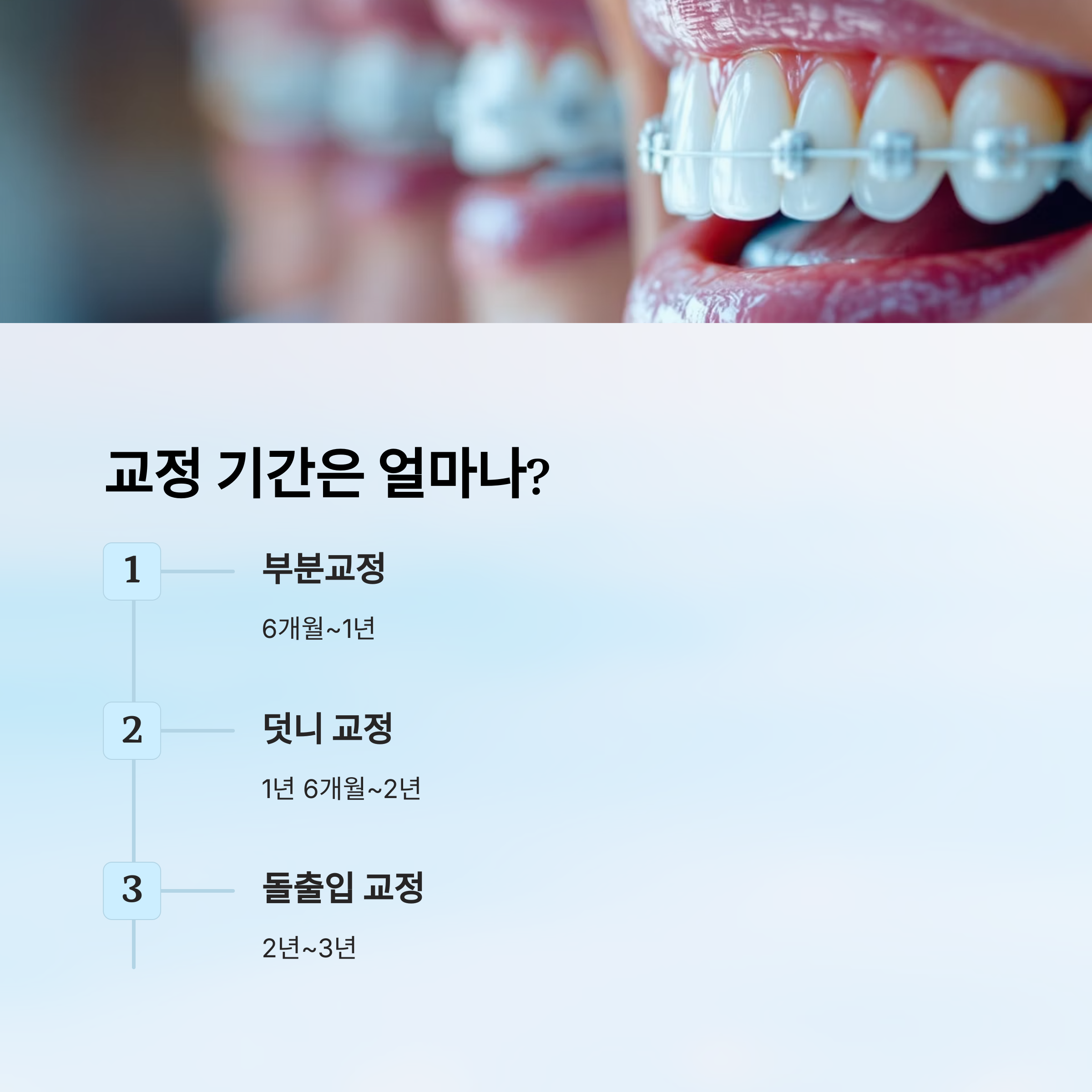 | 부분교정 | 6개월~1년 | 앞니만 교정할 경우 빠르게 끝남 |