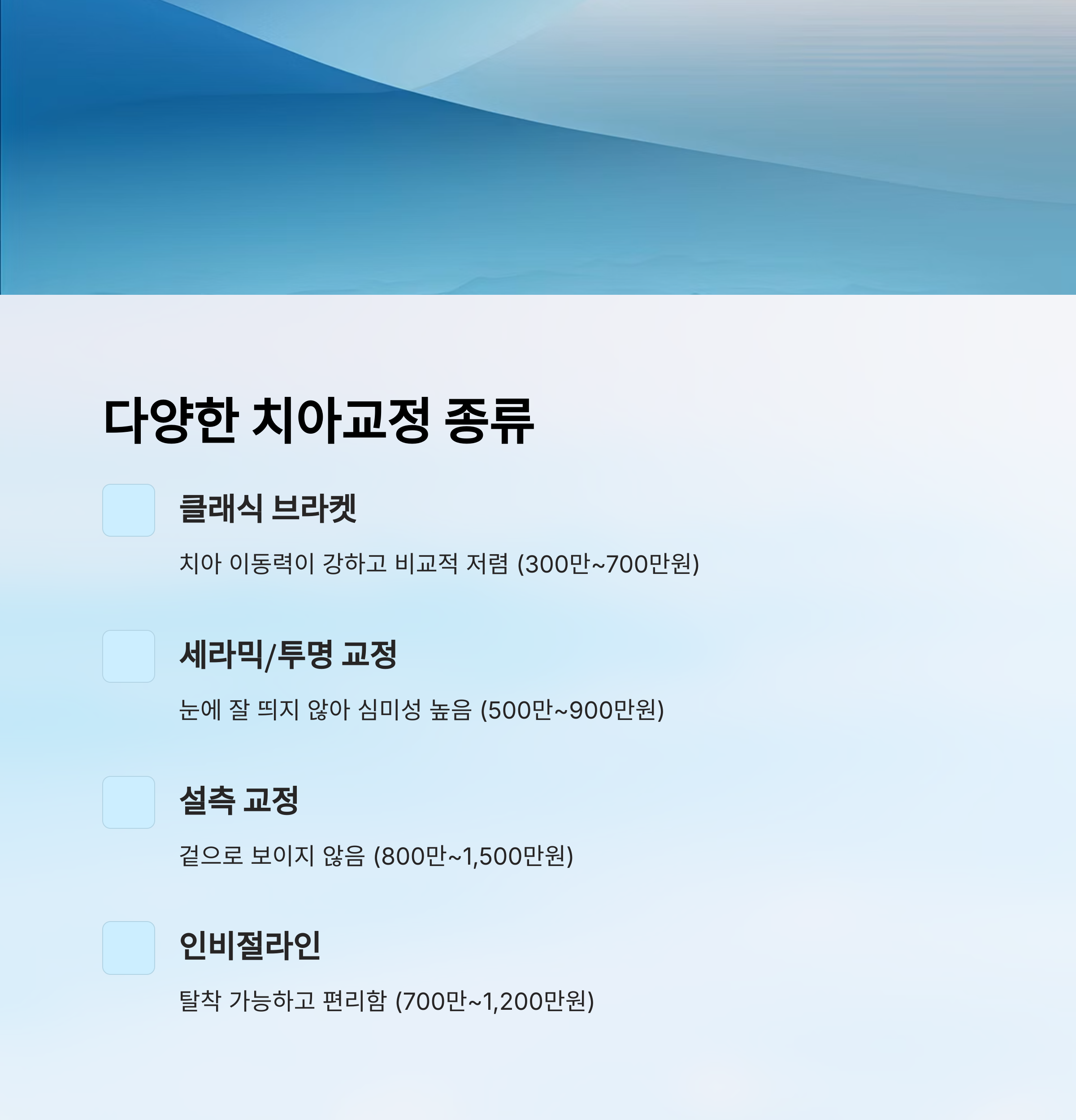 치아교정에는 다양한 방법이 있어요. 가장 일반적인 교정 방법과 각각의 장단점을 비교해볼게요! 🏥