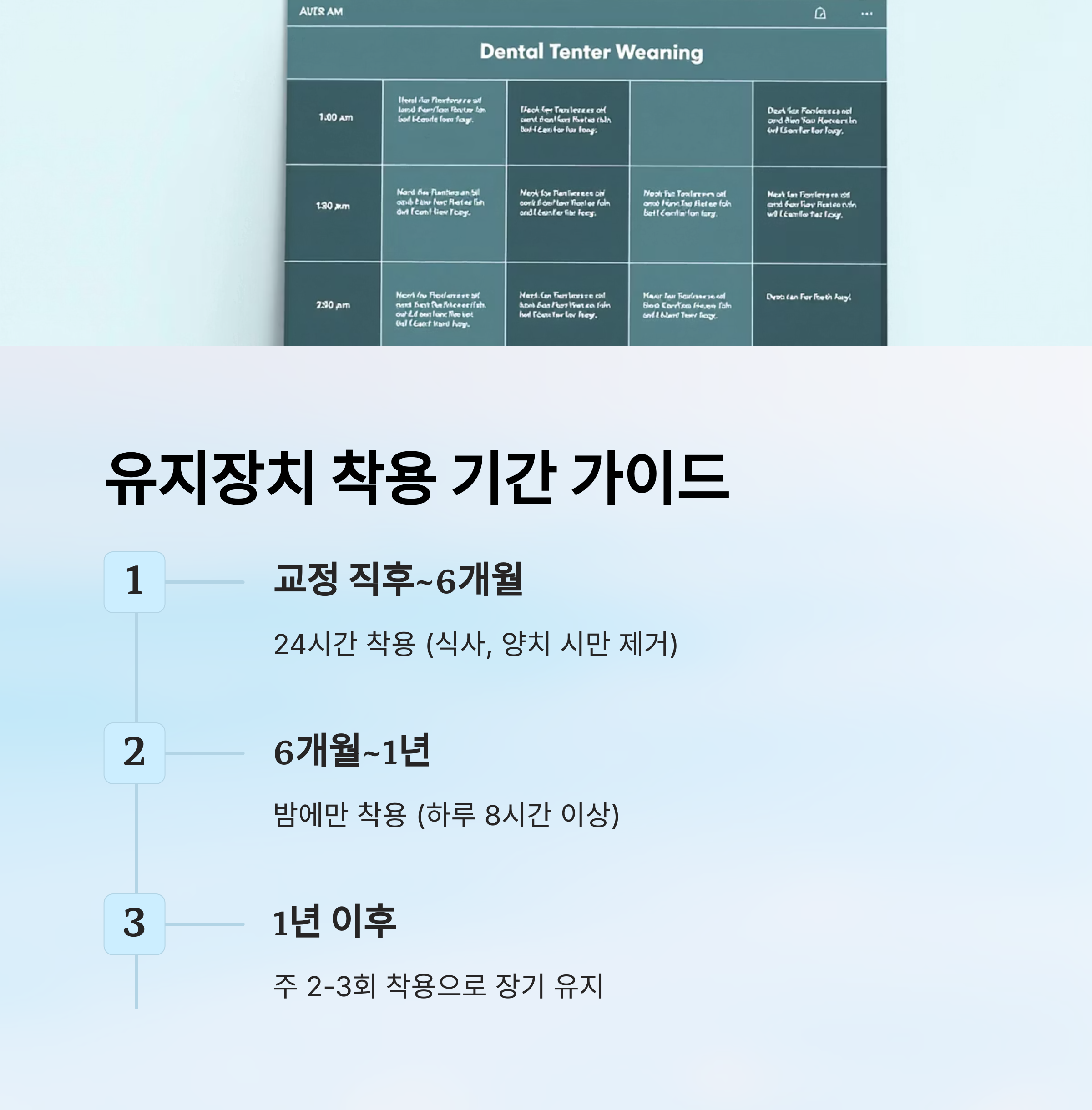 | 교정 직후 ~ 6개월 | 24시간 착용 | 음식 섭취, 양치 시만 제거 |