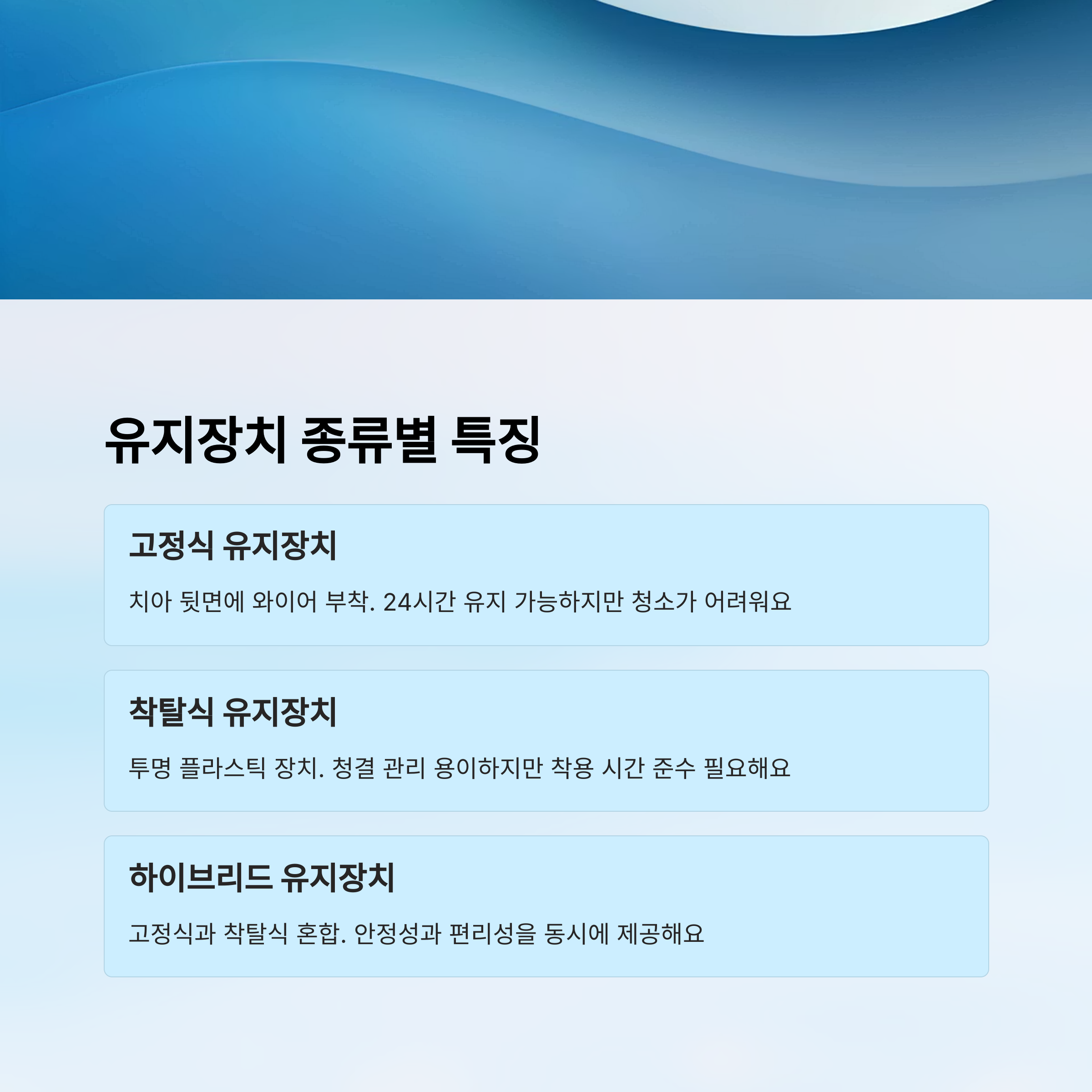유지장치는 크게 고정식과 착탈식으로 나뉘어요. 각 방식마다 장단점이 있기 때문에 치과 상담을 통해 본인에게 맞는 타입을 선택하는 것이 중요해요.