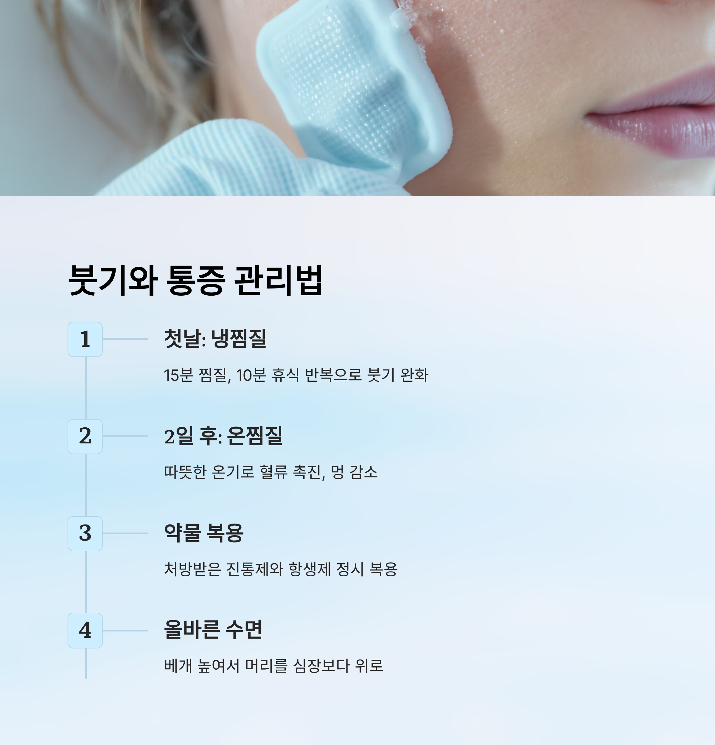 | 얼음찜질 | 시술 후 첫날 | 붓기 완화 | 15분 이상 연속 사용 금지 |