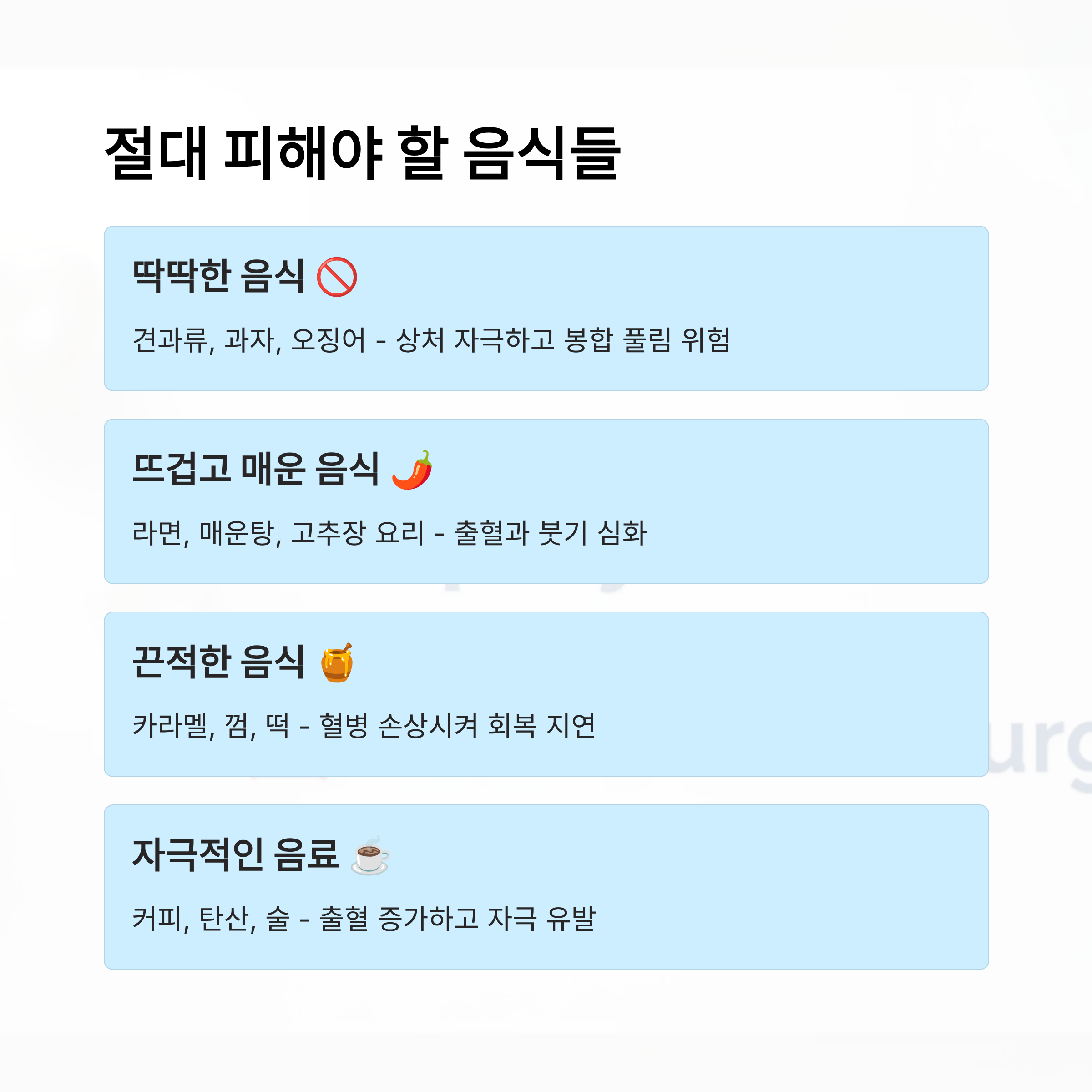 | 딱딱한 음식 | 견과류, 과자, 오징어 | 상처 자극, 봉합 풀림 위험 |