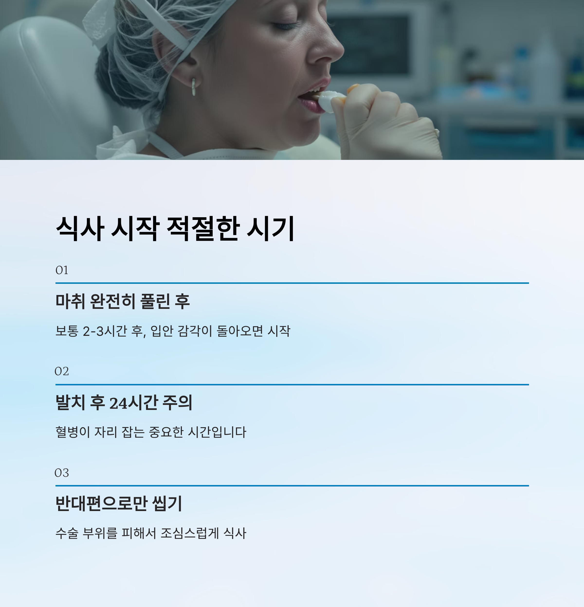 | 발치 | 마취 풀린 후 + 2~3시간 | 미음, 요거트 | 24시간 빨대 사용 금지 |