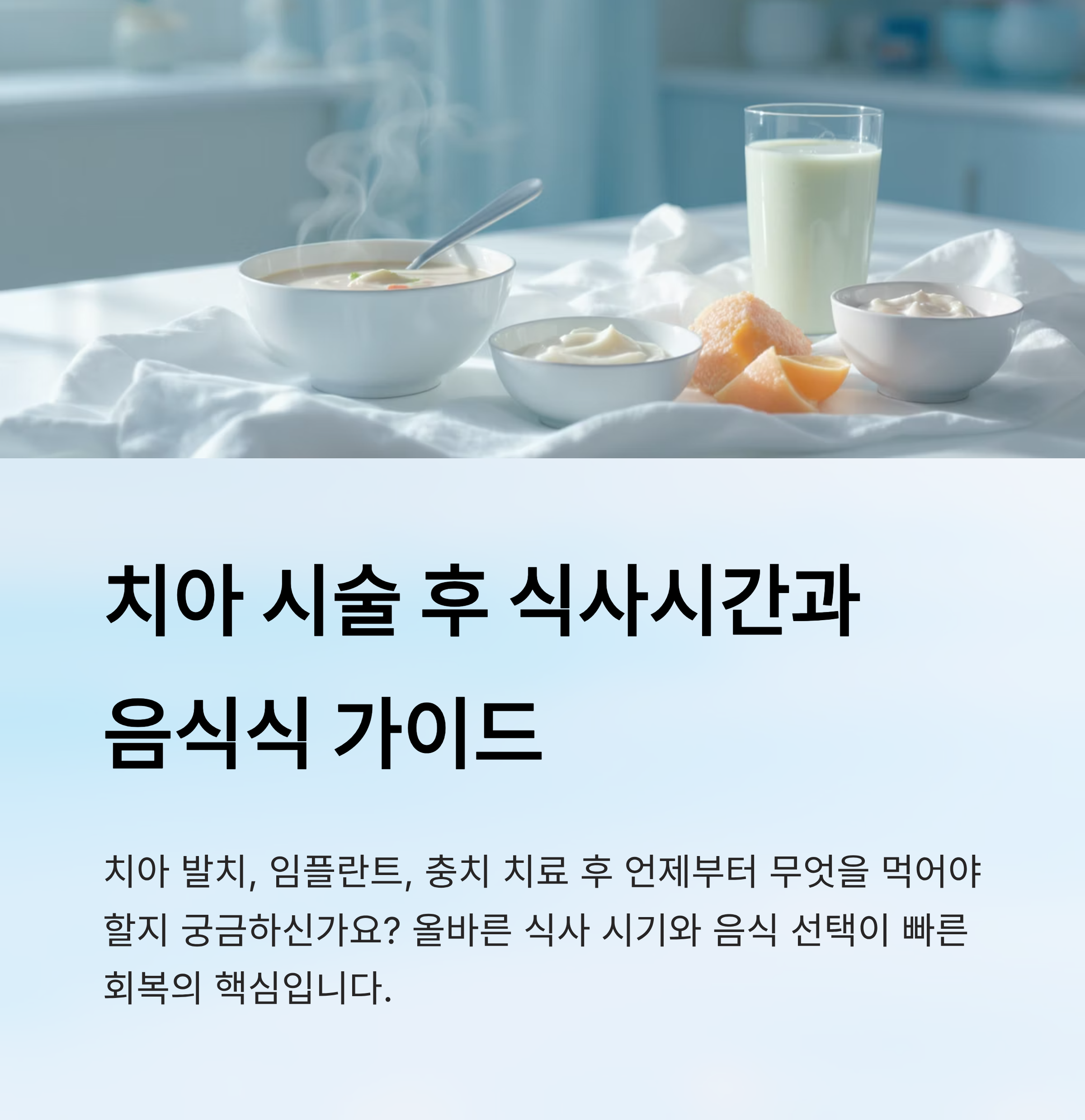 치아 발치나 임플란트, 충치 치료 같은 시술을 받은 뒤에는 언제 식사를 시작해야 하는지, 어떤 음식을 먹으면 좋은지 궁금할 때가 많아요. 특히 마취가 풀리고 난 직후에는 입안이 민감해져서 잘못된 음식 선택이 회복을 늦추거나 통증을 더 심하게 만들 수 있답니다.