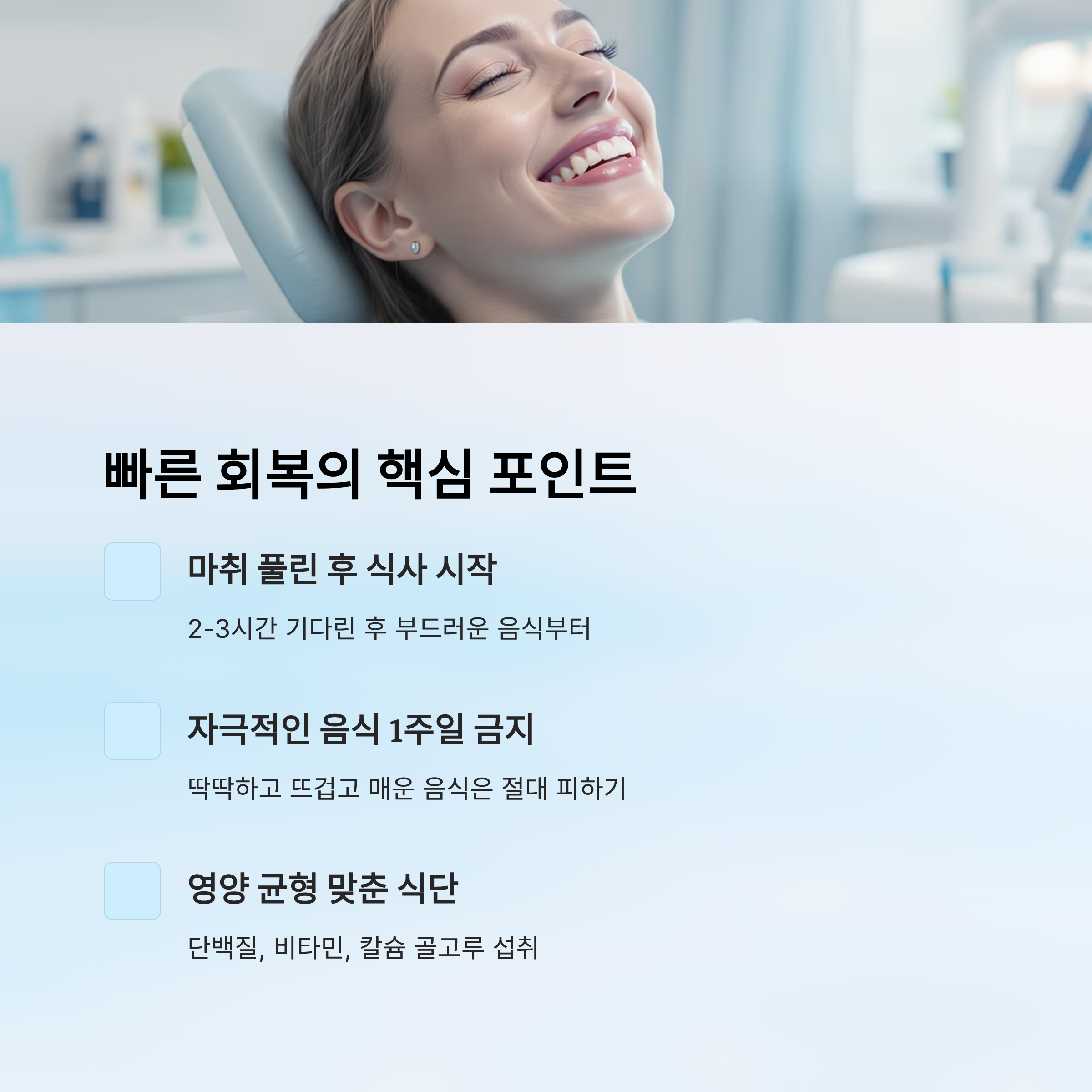 | 임플란트 | 마취 풀린 후 + 하루 | 스무디, 죽 | 씹는 음식은 최소 1주 뒤 |