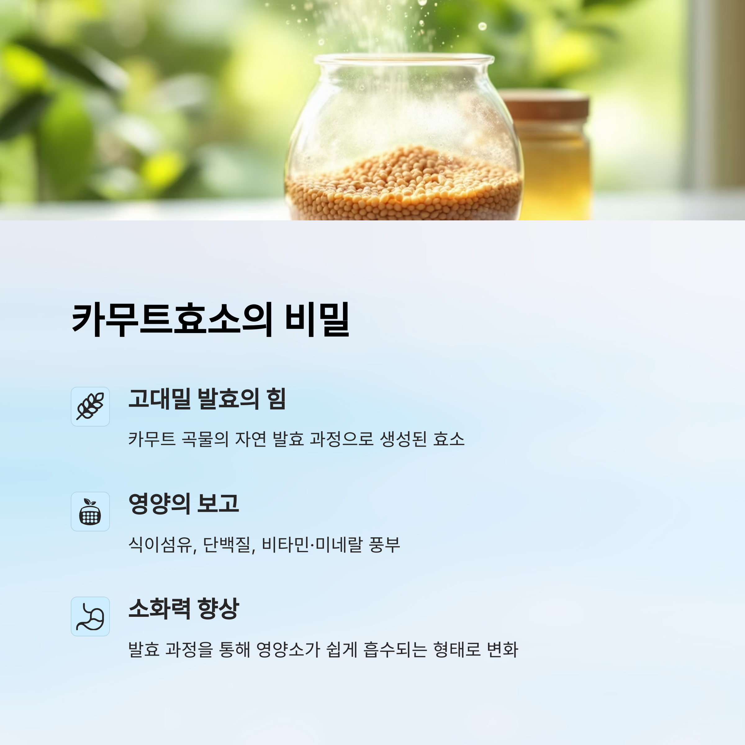 발효 과정에서는 단백질과 탄수화물, 지방이 보다 간단한 형태로 분해되면서 인체에 더 쉽게 흡수될 수 있는 상태가 되는데요. 이 과정에서 자연 발생하는 다양한 소화 효소가 함께 생성되기 때문에, ‘카무트효소’라는 이름이 붙었어요.
