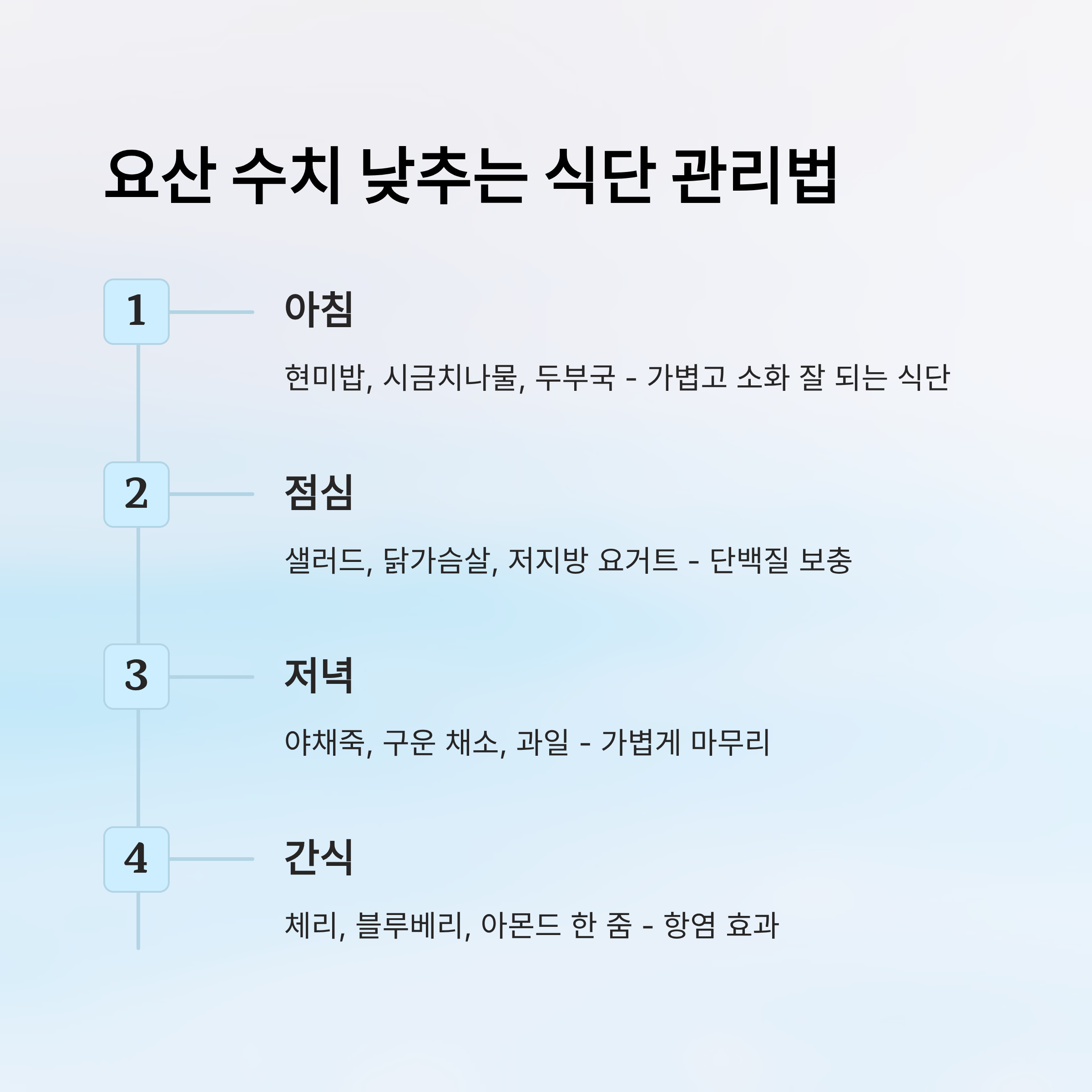 하루 식단은 채소와 과일을 중심으로 구성하는 게 좋아요. 아침에는 현미밥에 나물 반찬을 곁들이고, 점심은 샐러드와 저지방 단백질, 저녁은 채소 위주의 가벼운 식사로 맞추는 식이 효과적이에요. 여기에 하루 2리터 이상의 수분 섭취를 더하면 요산 배출이 원활해져요.
