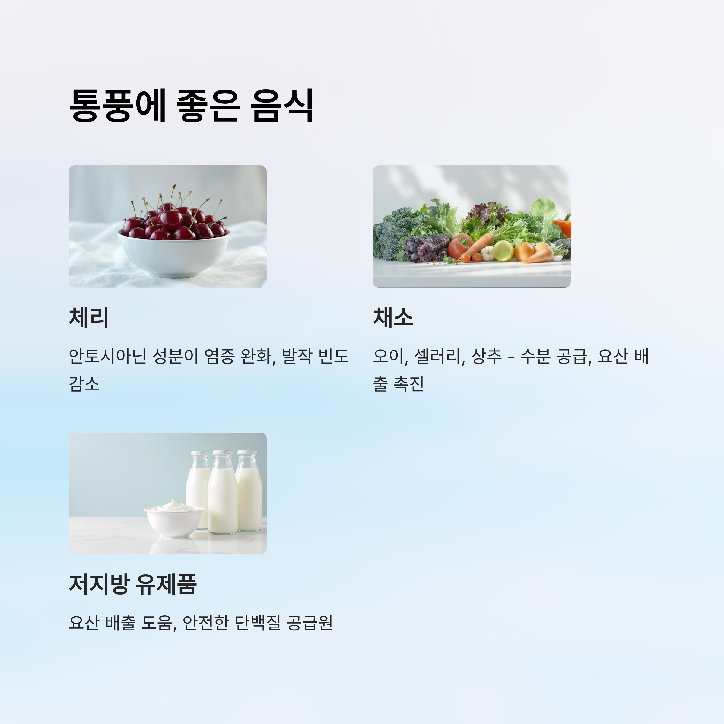 | 저지방 유제품 | 우유, 요구르트, 저지방 치즈 | 요산 배출 도움, 단백질 공급 |
