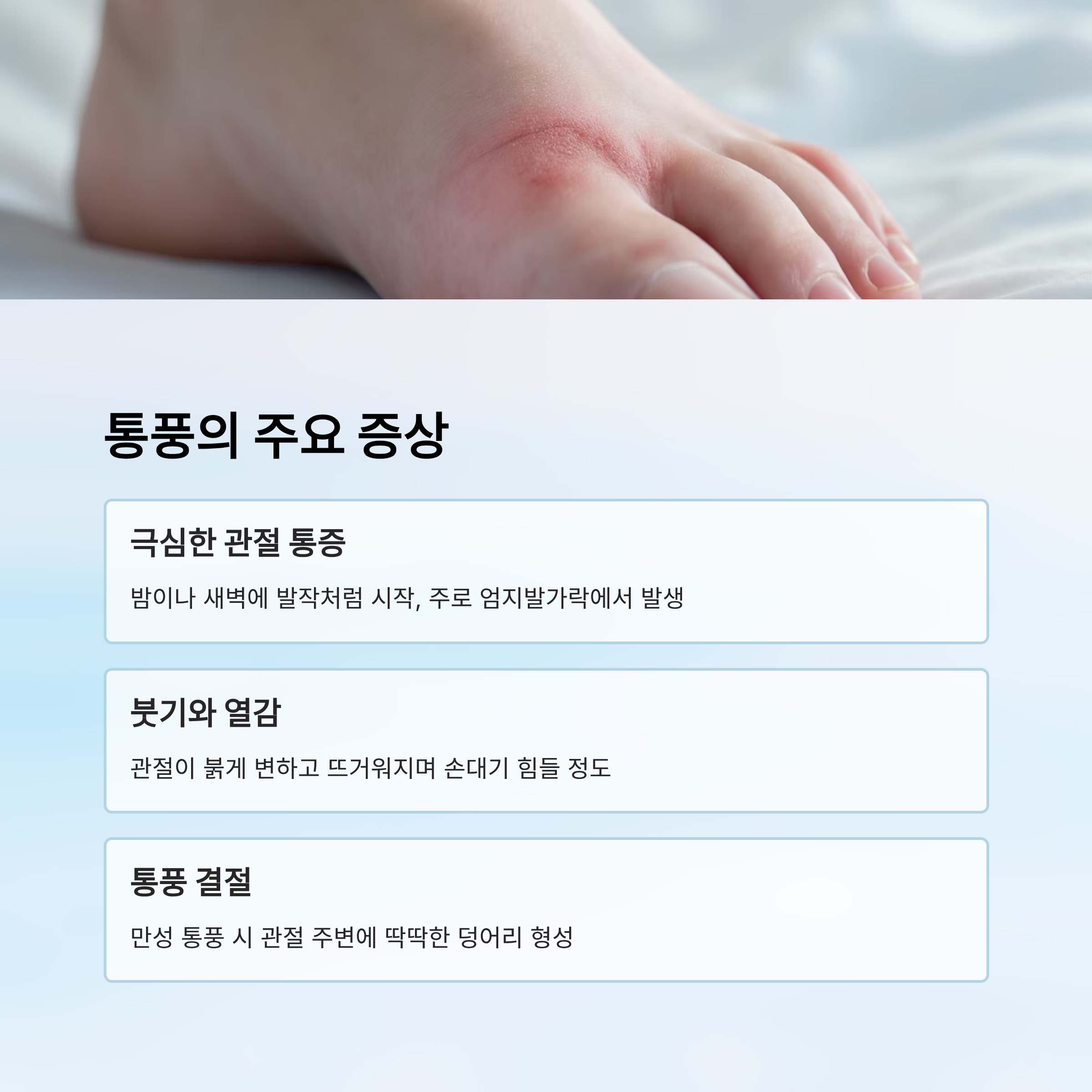 요산이 혈액에 과도하게 쌓이면서 관절에 결정체를 만들고, 그 결과 염증과 심한 통증을 유발하는 것이 통풍의 특징이에요. 특히 발가락, 발목, 무릎 등 말초 관절에 잘 생기는데, 작은 발가락 관절 하나만 붓고 아파도 걷기조차 힘들어진답니다.