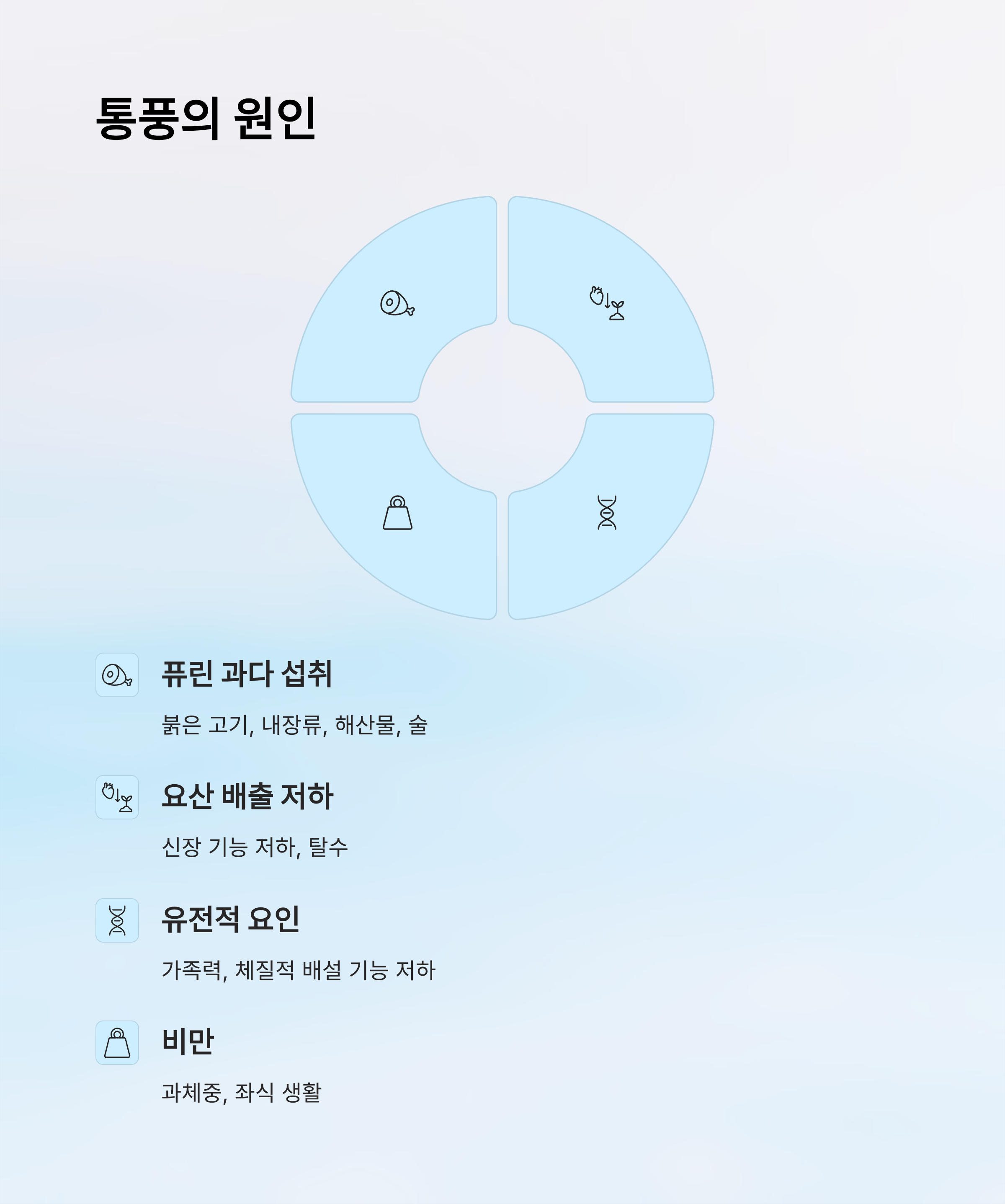통풍의 원인을 이렇게 정리해 보면, 단순히 한 가지 요인으로만 발병하지 않는다는 걸 알 수 있어요. 체질적인 요인과 생활습관, 환경적 요인이 모두 맞물려 나타나는 결과라고 볼 수 있어요. 그래서 예방과 관리도 여러 방면에서 동시에 이뤄져야 효과가 커요.