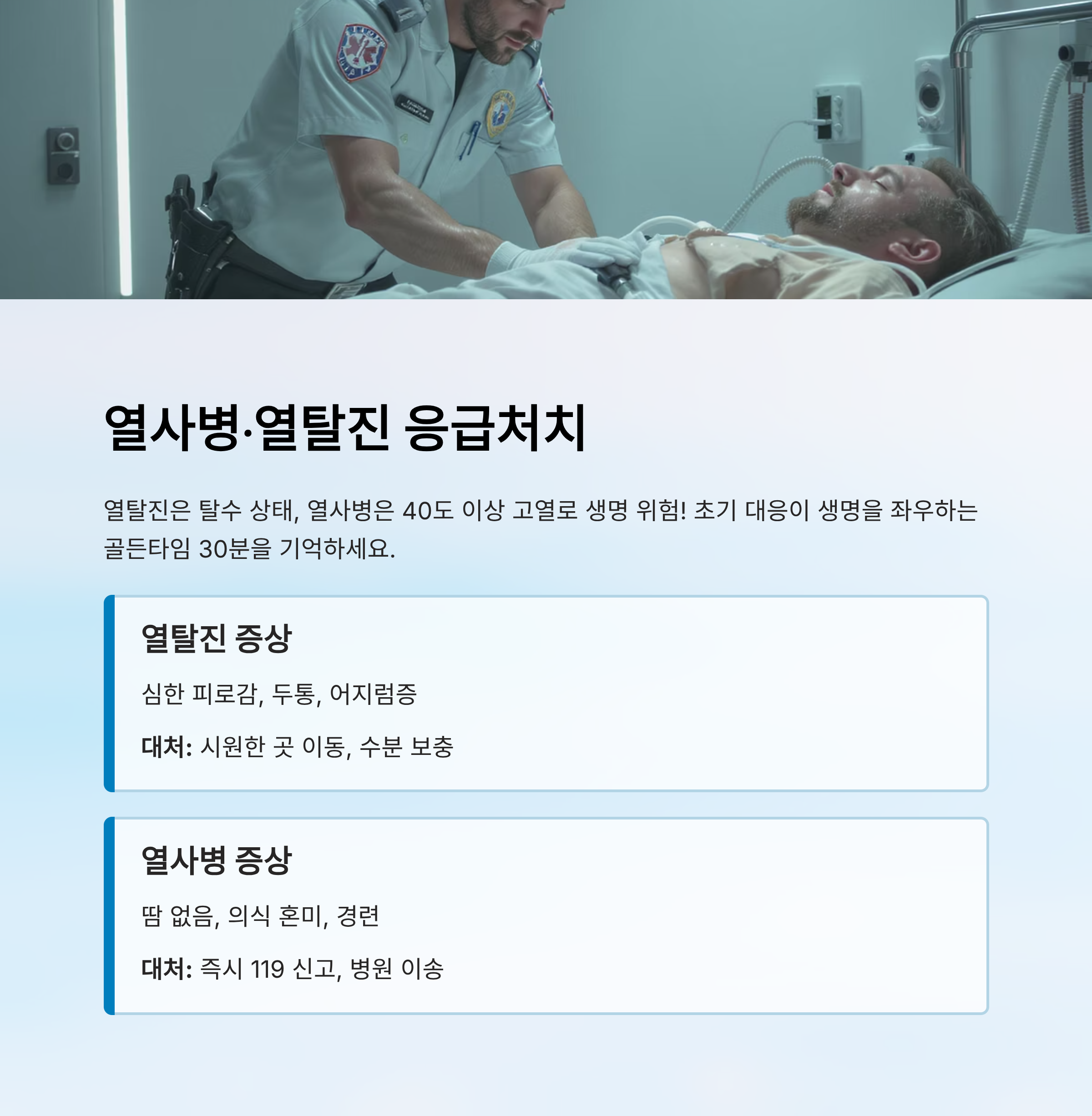 | 열사병 | 고열, 의식 저하, 땀 없음 | 즉시 119 신고, 체온 낮추기 | 무조건 즉시 이송 |