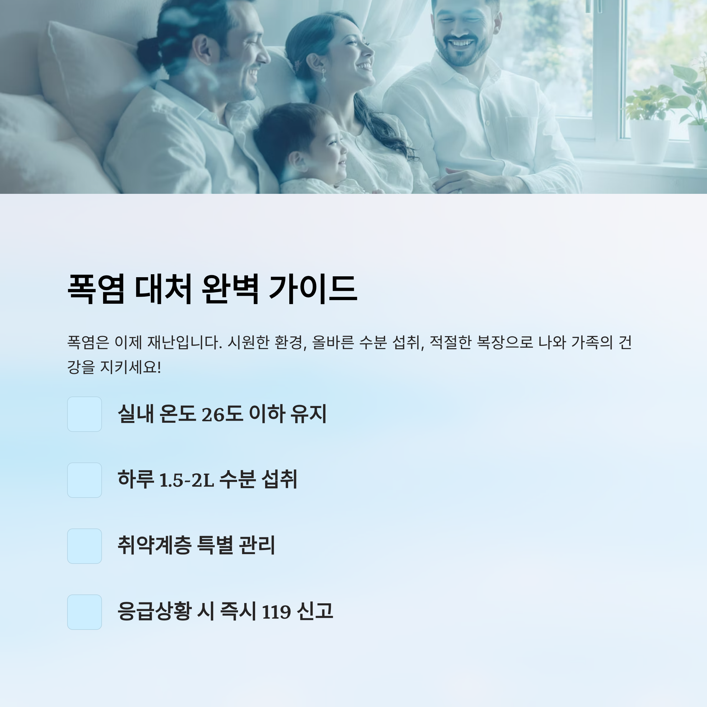 실내에만 있다고 안심하기는 어려워요. 창가에서 오래 앉아있거나 실내 통풍이 안 될 경우, 오히려 열이 축적될 수 있어요. 외출 준비를 철저히 하고 옷차림 하나까지도 신경 쓰는 것이 나와 가족의 건강을 지키는 첫걸음이에요. 다음으로는 폭염에 특히 취약한 어르신과 어린이들을 위한 응급 대처 방법을 알아볼게요. 👶👴