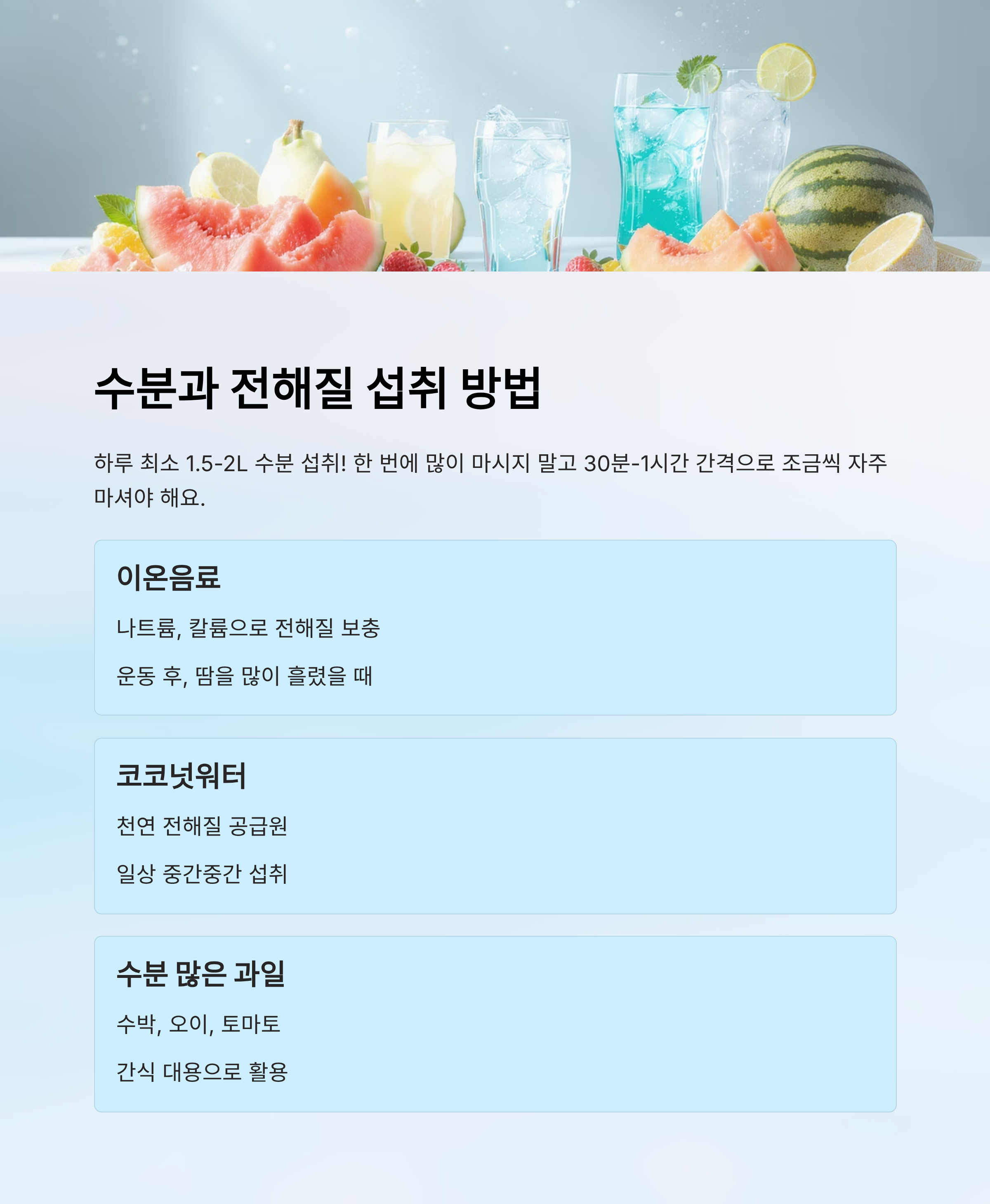 WHO와 질병관리청도 폭염 시 하루 최소 1.5~2L 이상의 수분 섭취를 권장하고 있어요. 단, 한 번에 몰아 마시기보다 30분~1시간 간격으로 조금씩 자주 마셔야 해요. 땀이 많아지면 전해질 손실도 심해지기 때문에 이온음료, 저염 식품, 오이·토마토처럼 수분과 전해질이 풍부한 식품도 함께 섭취하면 좋아요.