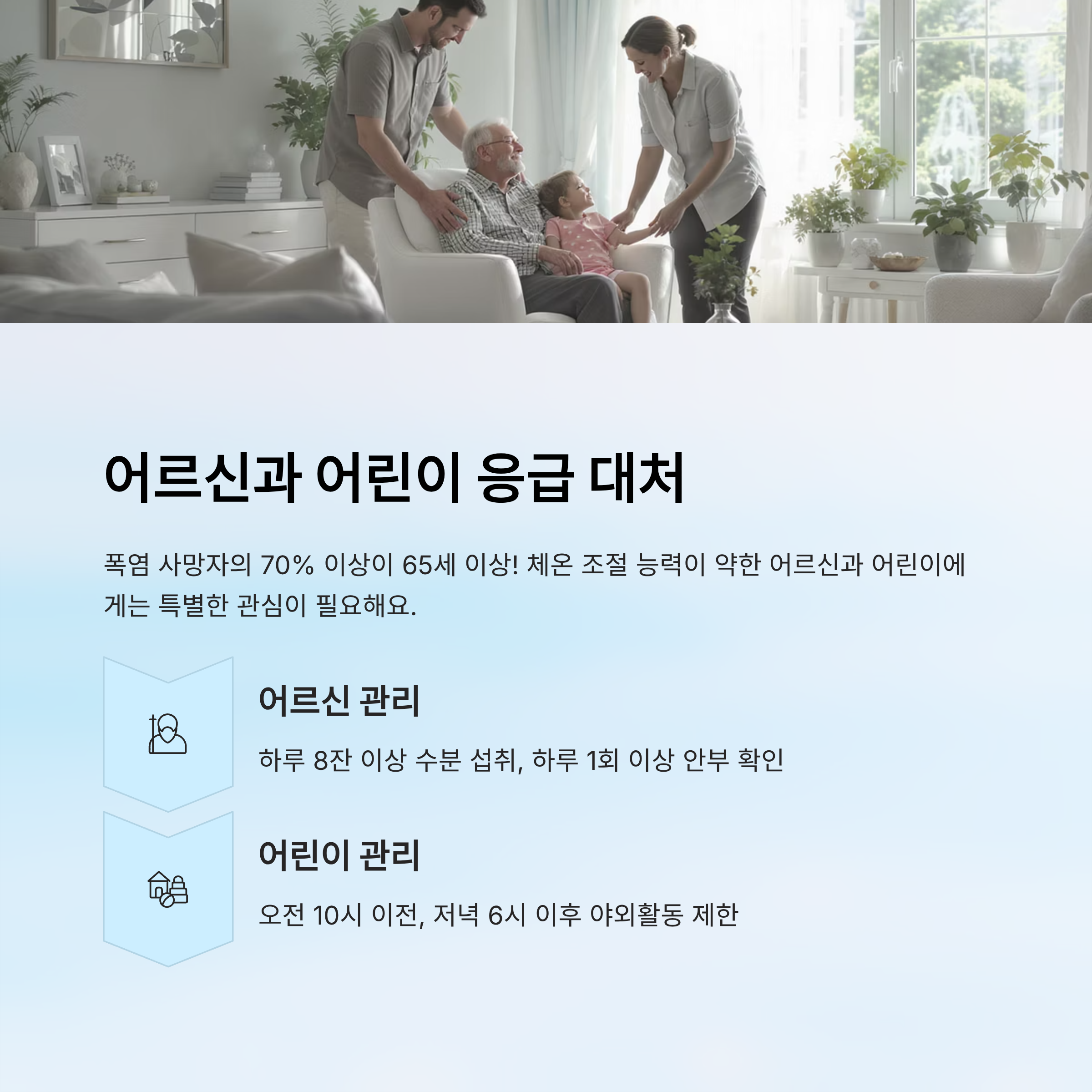| 어린이 | 체온 급상승, 수분 손실 | 실내 놀이 유도, 얼음팩 활용 | 얼굴 빨개지면 즉시 냉방 |