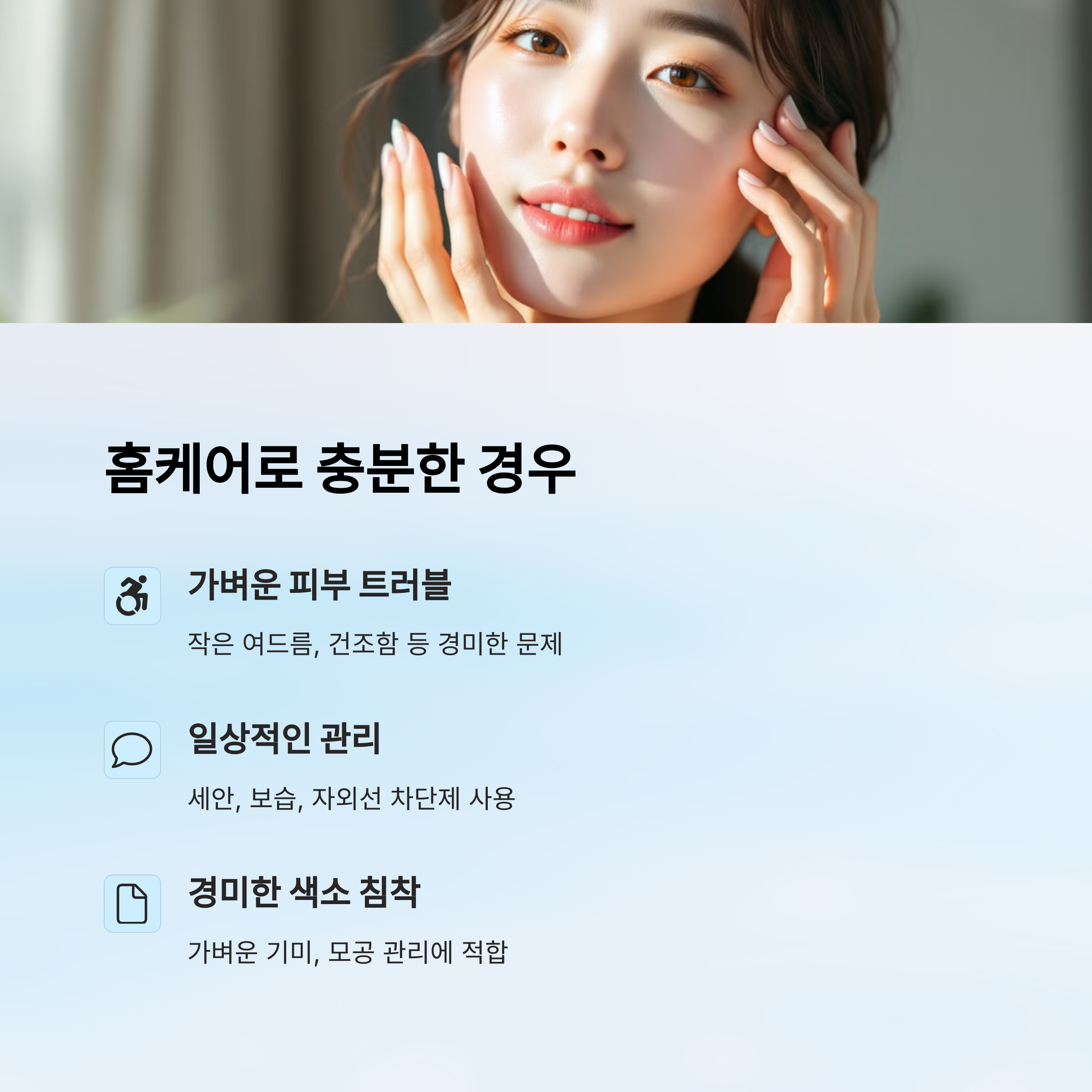 홈케어만으로도 충분한 경우는 의외로 많아요. 피부가 예민하지만 증상이 심하지 않거나, 트러블이 반복되지 않는 경우라면 무리하게 병원을 찾지 않아도 돼요. 기본은 ‘진정 + 보습 + 자극 최소화’예요.