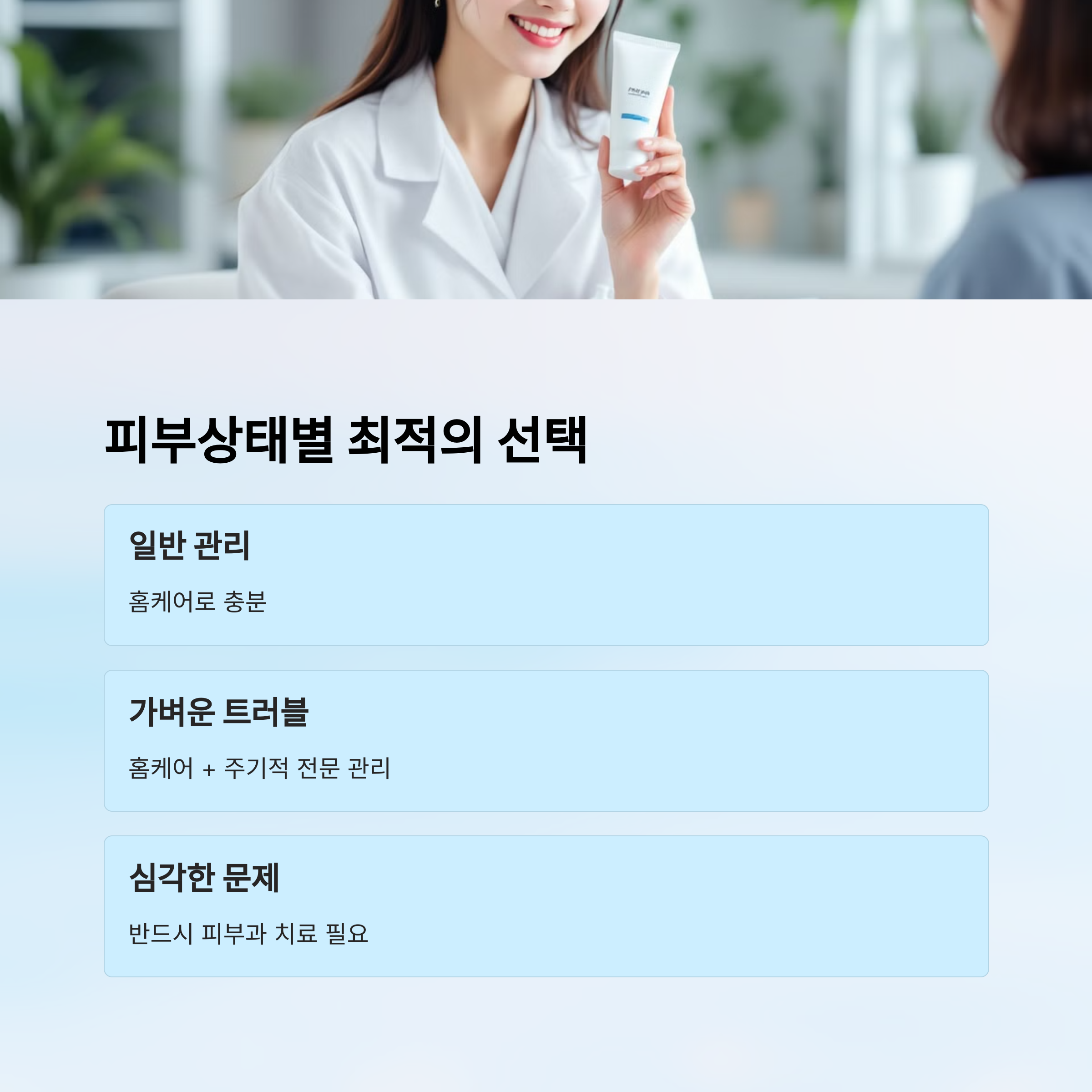 ✔ 피부가 예민해졌지만 가려움, 붉음은 적다 → 홈케어 진정 루틴 ✔ 여드름이 조금씩 생기고 있다 → 홈케어 + 진정 크림 ✔ 트러블이 커지고 통증이 있다 → 병원 진료 추천 ✔ 알레르기처럼 넓게 퍼진 발진이 있다 → 병원 진료 ✔ 홈케어를 해도 개선이 안 된다 → 병원+홈케어 병행