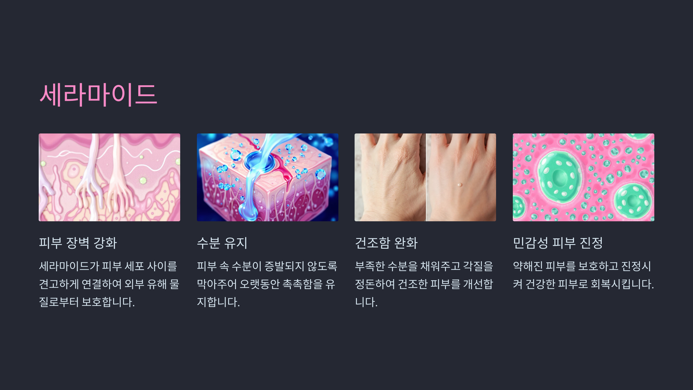 세라마이드는 피부 장벽을 강화하고 수분을 유지하는 데 중요한 역할을 하는 성분입니다. 건성 및 민감성 피부에 특히 적합합니다.